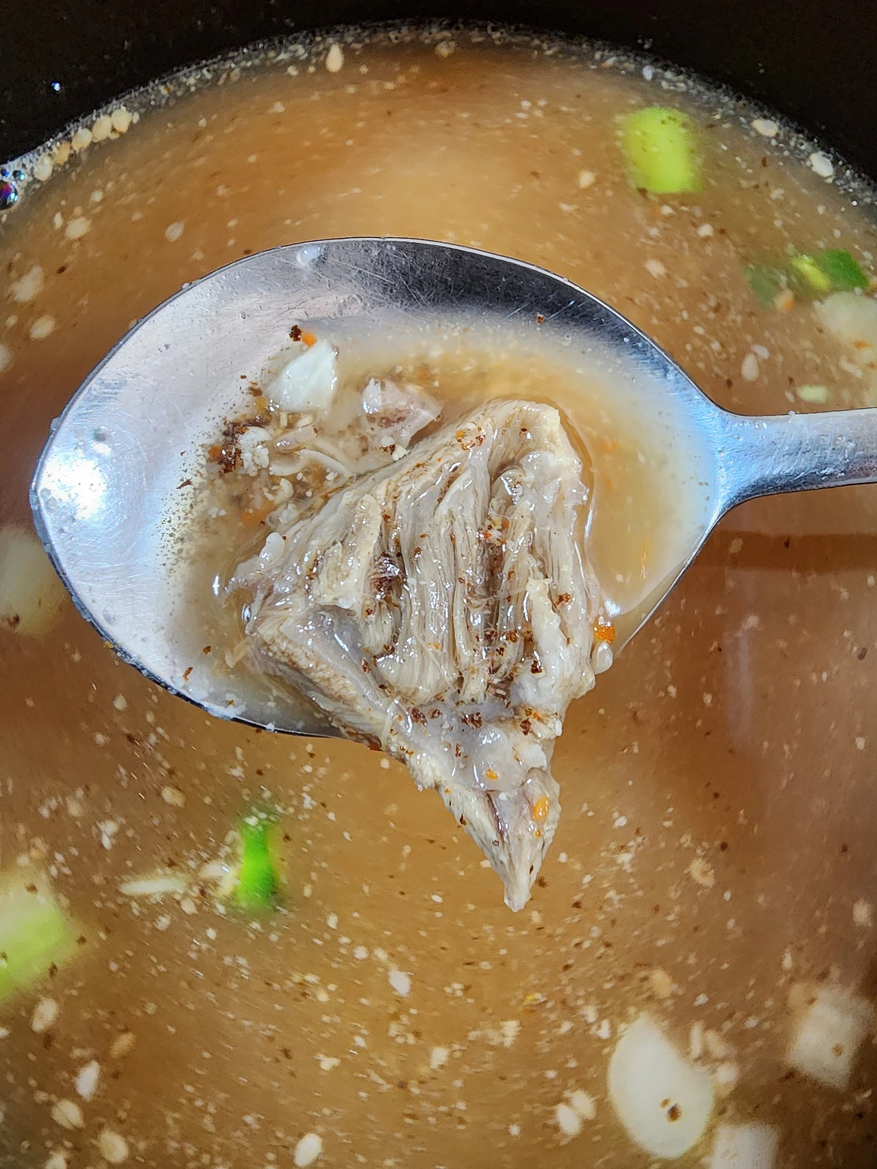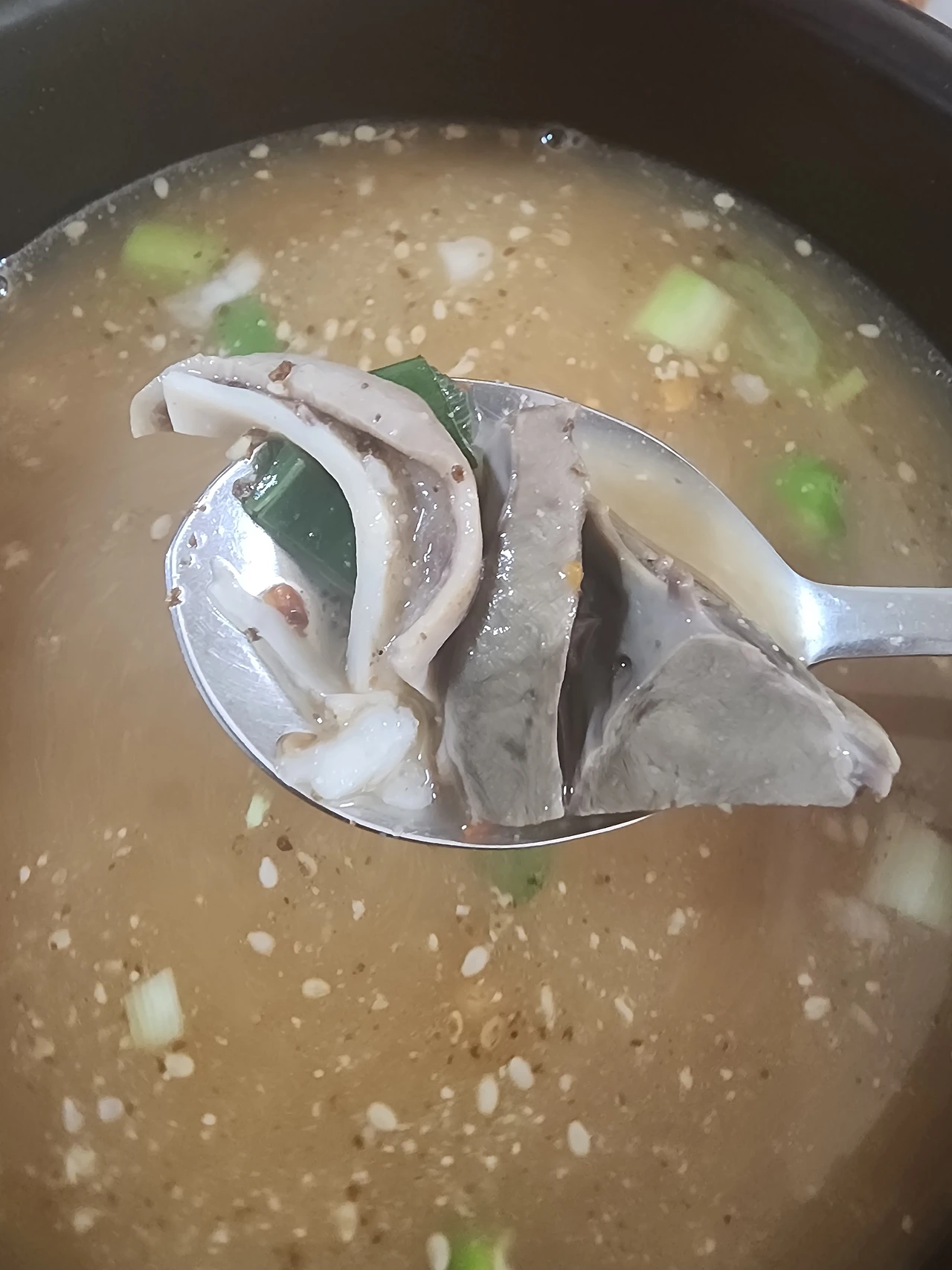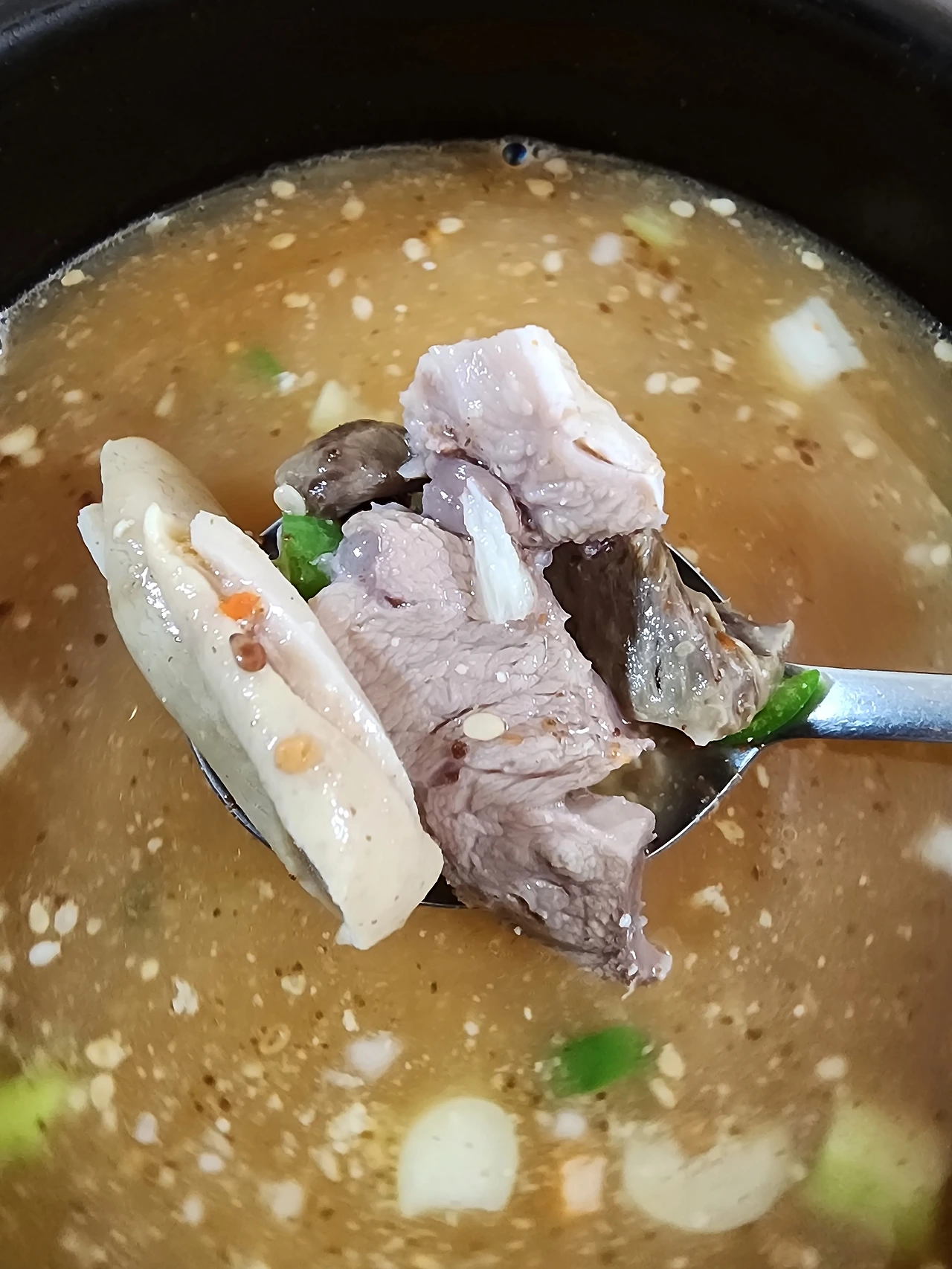 김고로는 들깨와 참깨, 파, 청양고추가 가득 다져서 들어간 맑은 국밥을 한두 숟갈 먼저 맛본다. 맑고 깔끔하며 진한 맛이 입안에 가득하다, 깨들이 많이 얹어져서 그런지 고소한 풍미가 있다.