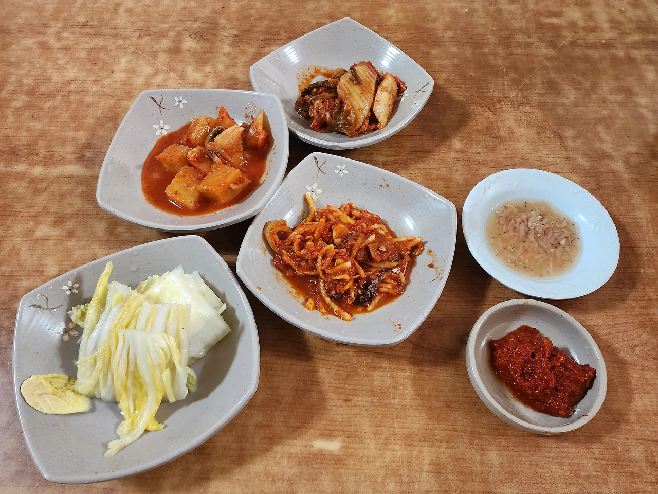 오랜 세월과 삶의 흔적이 굽은 등과 느린 걸음걸이에서 나타나는 여 사장님은, 그럼에도 불구하고 힘 있는 손과 발로 우뚝 서서 냉장고 사이를 돌아다니며 냉장고에서 이런저런 반찬을 꺼내신다. 대부분 영동지방의 해안가에서 볼 수 있는 여러 생선과 젓갈들을 넣고서 푹 삭히고 발효시킨 깍두기, 배추김치, 무생채, 백김치, 맑은 새우젓에 붉은 다진 양념.