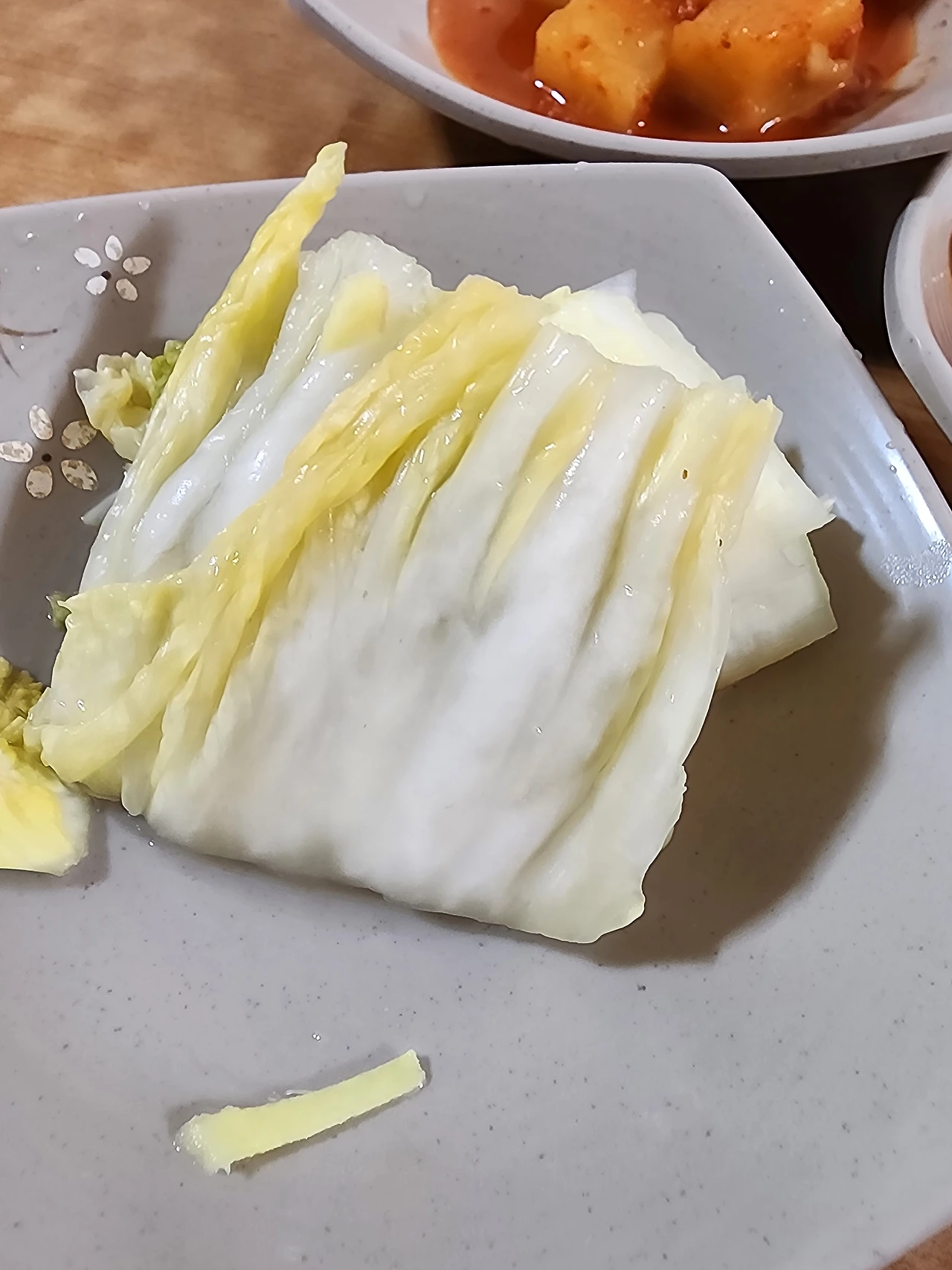 사장님은 냉장고에서 플라스틱 채반에 담긴 식은 돼지부속들을 한 움큼 잡으시고는 뚝배기에 넣으시고 건물 내부 쪽, 바깥 부엌으로 나가신다. 국밥육수는 건물 내부 부엌에 있는 냄비에 보관 중이신 듯, 거기서 육수를 뚝배기에 넣으시고 갖고 들어와 뚝배기를 부글부글 끓이신다. 나는 그 사이에 반찬들의 맛을 하나씩 본다, 간이 제일 약할 것이라 예상되는 커다란 백김치 배추를 한쪽 집는다.