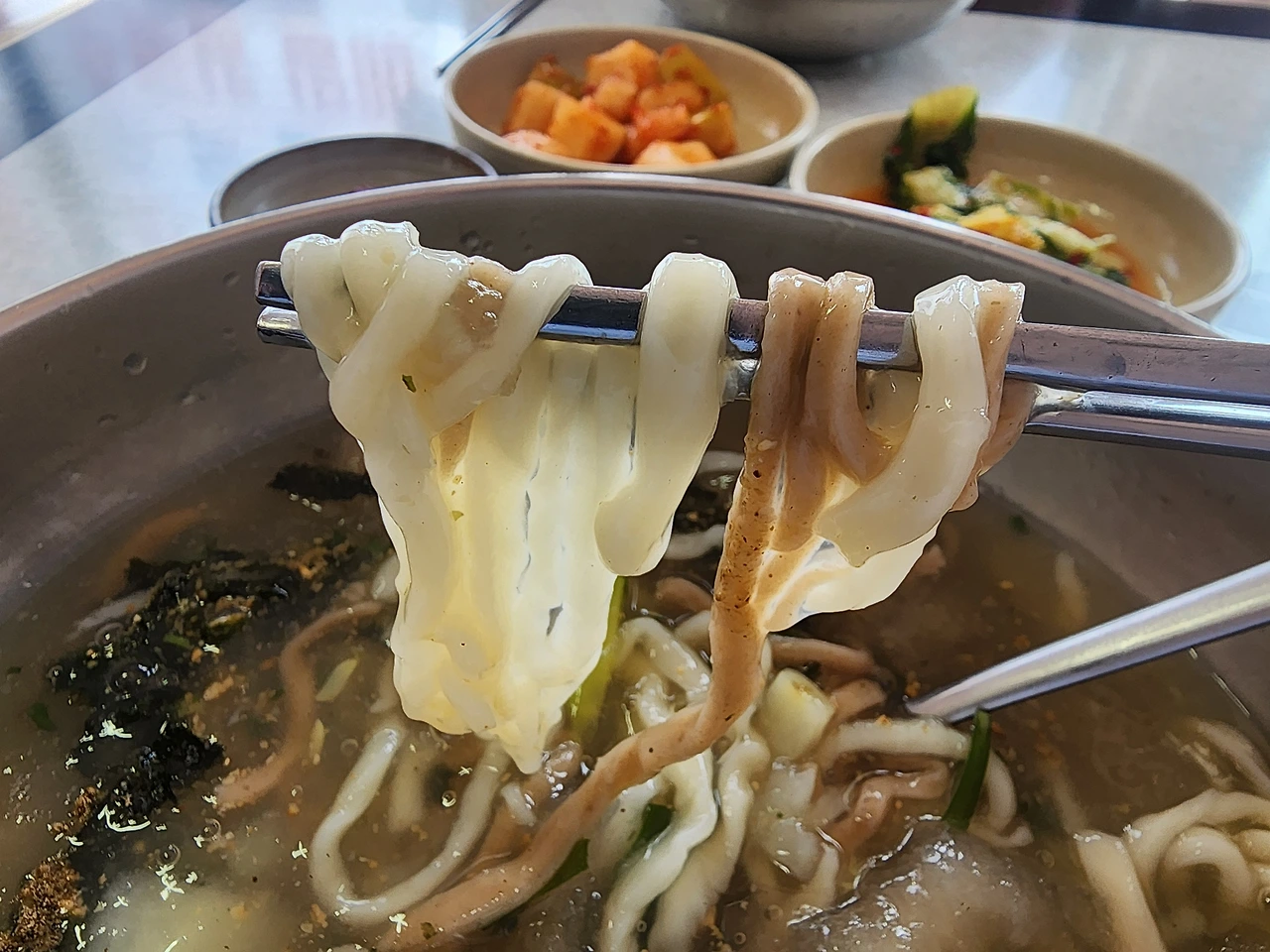 "칼국수가 밀가루도 있고 메밀가루도 있네, 색도 이쁘고 좋다."