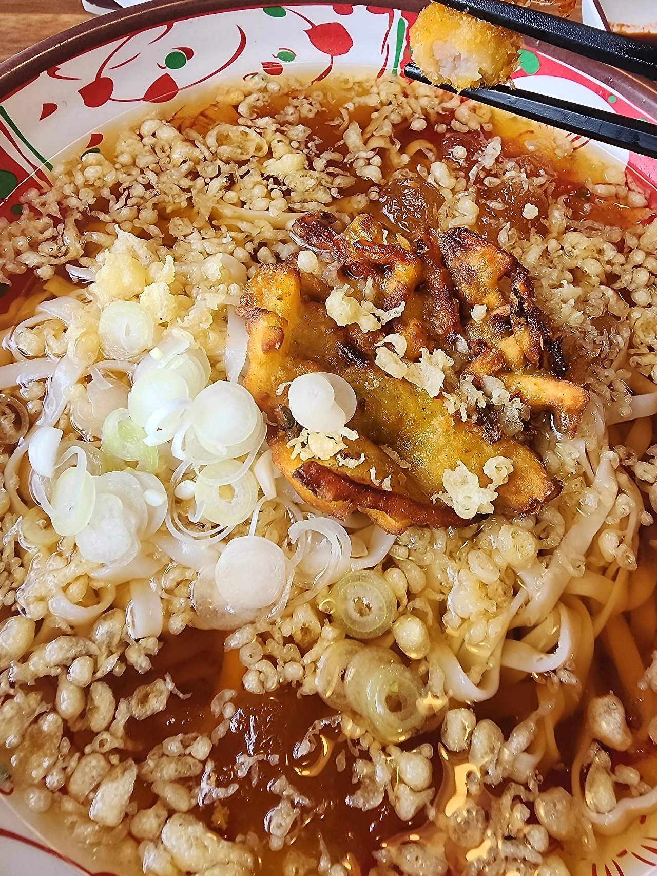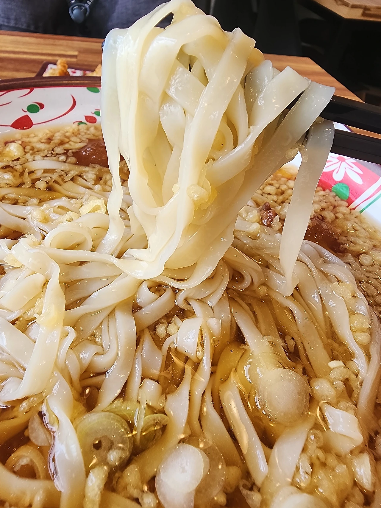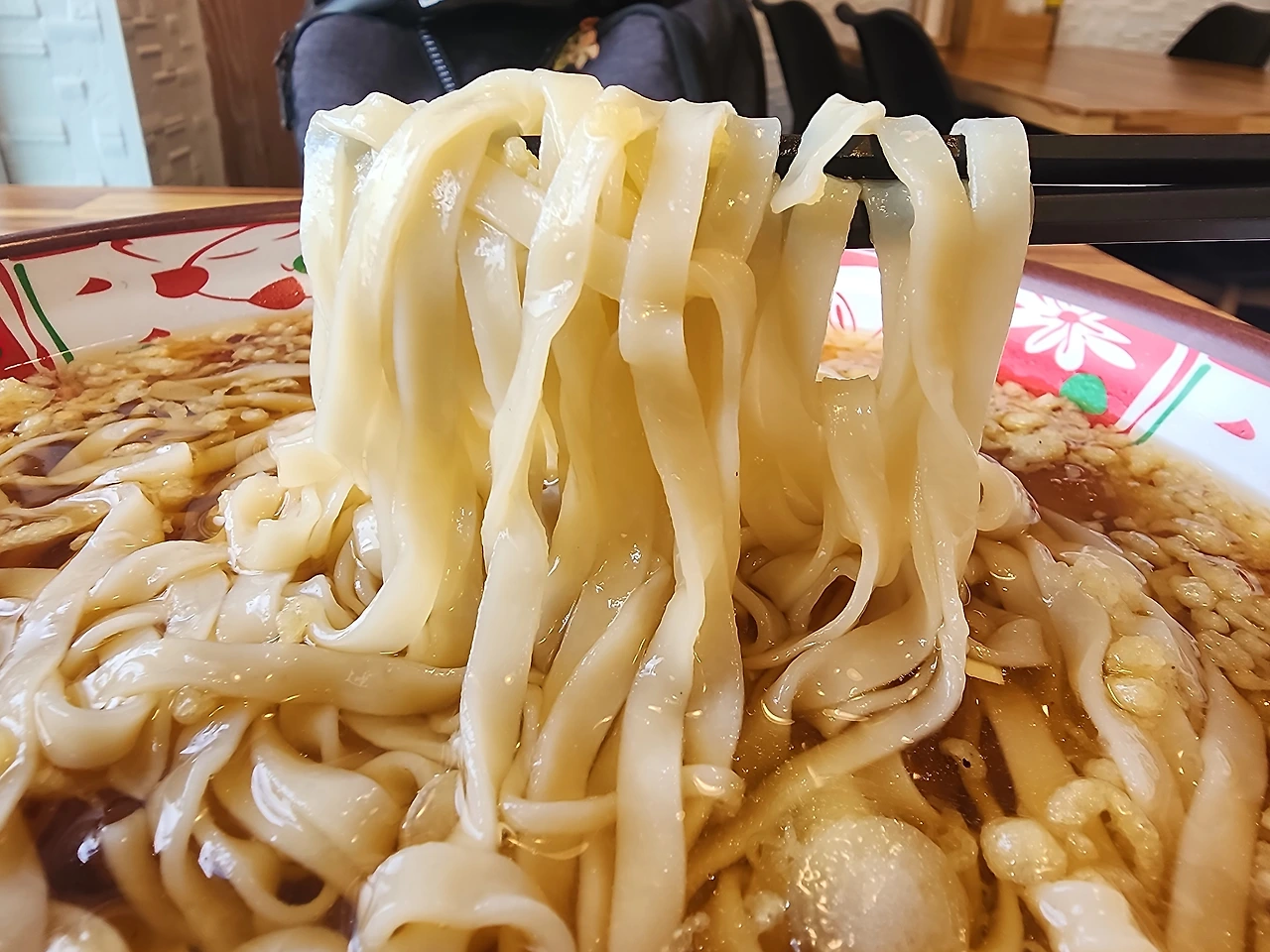 하지만 김고로가 기다리고 있던 것은 위에 고명으로 올려진 튀김들의 맛이 아니라 육수를 촉촉하게 겉면에 머금은 깜댕이칼짬의 수제 반죽면이다. 곱빼기를 주문해서 그런지, 거의 1인분을 넘어 2인분이 돼버린 거대한 접시에 젓가락을 찔러 넣는다.