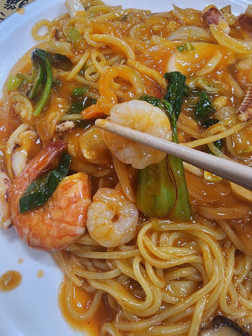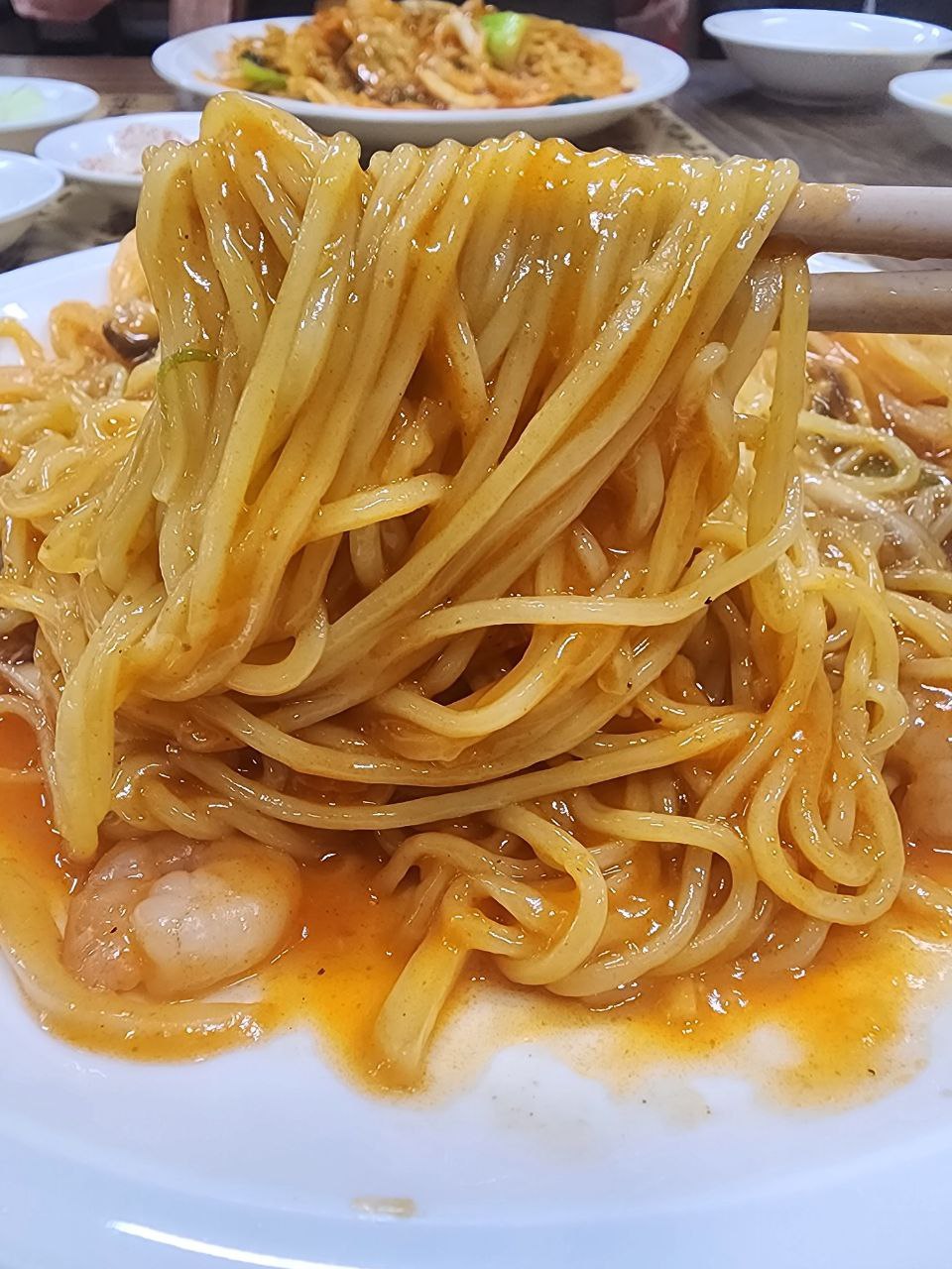 뜨끈뜨끈한 열기와 매운 짬뽕의 풍미가 볶음짬뽕에서 용처럼 뭉게뭉게 올라와 코로 들어온다. 웍에서 막 나온 불향과 고추, 마늘 등의 향신료가 서로 몸을 밀치면서 뛰어오니, 나도 맞아주어야겠지. 젓가락을 들고서 청경채와 면을 잡아 올린다. 묽은 듯하면서도 끈적한 짬뽕면이 젓가락에 말려서 올라온다, 입에 들어오면서 찰지고 진한 면발과 짬뽕소스가 입안에 벽지처럼 도배된다. 매콤함과 얼큰함, 해물의 시원함과 무겁고 농밀한 식재료들의 맛이 면발과 말려들어온다.