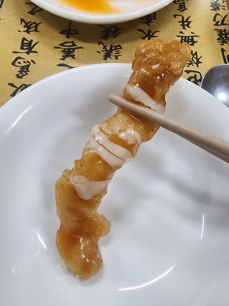 바삭한 튀김옷은 쫄깃하고 튀김옷 안의 고기들은 지방과 살코기가 적당하게 섞인 부위를 쓰셔서 투명하고 탁한 색깔의 익은 고기와 비계가 조화롭게 섞여있다, 탕수육이 왜 이렇게 바삭하고 쫄깃한가 궁금해서 한입 베어 먹고서 안을 들여다보니 비계가 홀의 조명에 반사되어 반짝거린다. 고기만두나 피자의 토핑, 멘치가스 등 압도적인 고기의 양으로 맛을 내는 음식들처럼, 탕수육도 살코기와 비계가 올바른 비율로 섞여 육즙과 쫄깃함, 부드러움과 고소한 맛을 작은 몸에 응축시켜 튀겨내는 것이 훨씬 맛이 좋다.