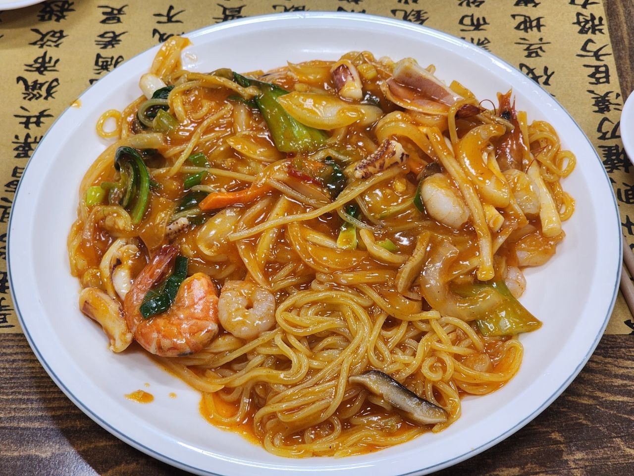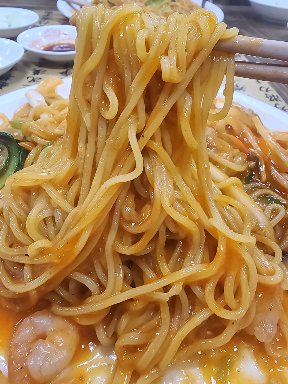 배가 많이 고팠던 이쁜 그녀와 김고로가 북경식 탕수육의 소스까지 긁어먹을 때쯤 넓고 동그란 접시에 각자의 볶음짬뽕이 푸짐하게 담겨서 나온다. 아래에는 노란 면발의 뭉치들이 넓게 붉은 짬뽕소스에 깔려있고 그 위에 청경채, 죽순, 버섯, 새우, 오징어, 양파 등 많은 짬뽕의 재료들이 올려져서 이것만 먹어도 배가 부를 모양새이지만 북경식 탕수육을 박살 낸 김고로와 이쁜 그녀가 두려워할쏘냐.