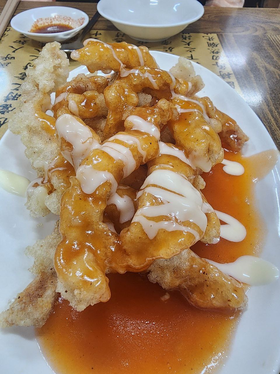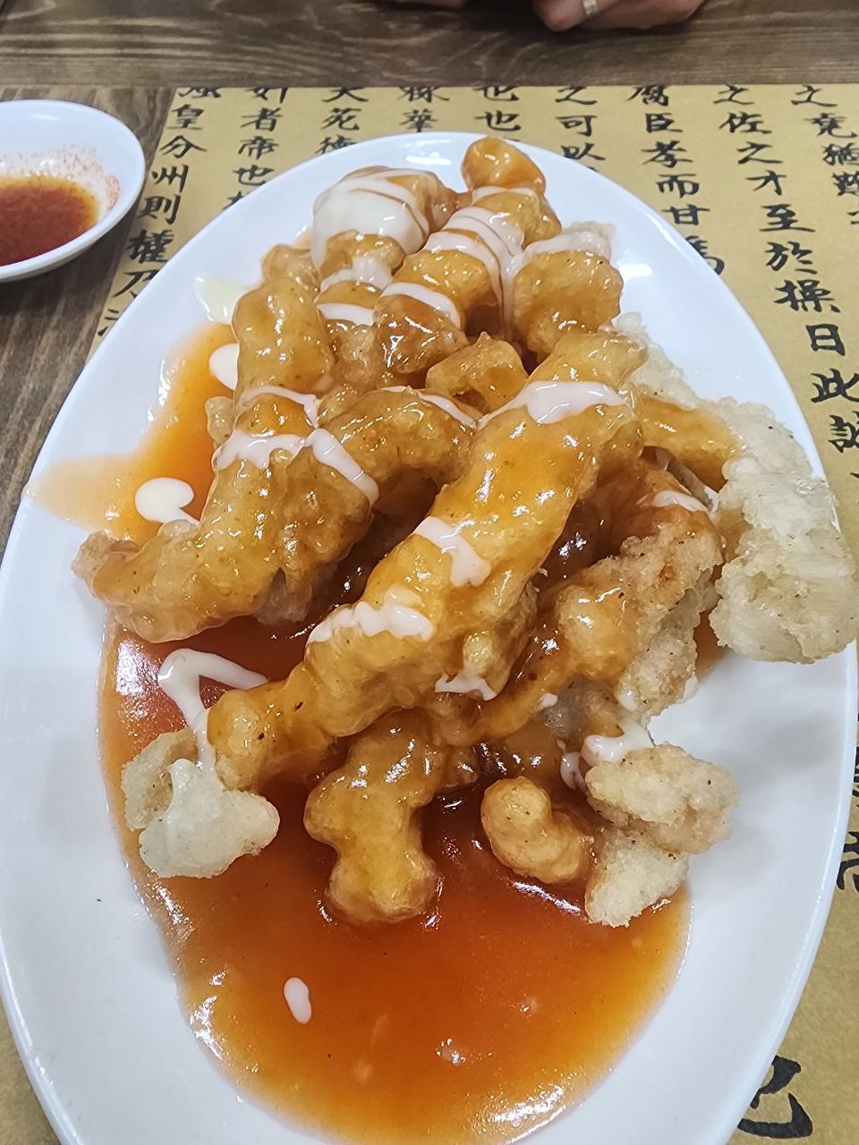 튀김 요리인 북경식 탕수육이 먼저 나왔다. 한국에서 알고 있는 탕수육은 사실 중국에는, 중국에 있는 한국식 중화요릿집에 가는 것이 아닌 이상, 없다. 정확히 말하자면 '탕수'소스는 존재하기 때문에 탕수소스를 튀긴 갈비조각에 끼얹어 먹는 '탕수패골' 혹은 탕수육 고기를 한국에서 먹는 것보다는 조금 더 길고 얇게 썰어서 튀겨 탕수 소스를 끼얹어 먹는 '탕수리지'가 한국사람들이 먹는 탕수육에 가까운 요리이다. 차이루에서 대접하는 북경식 탕수육은 중국에서 먹는 탕수리지와 비슷한 모습이다, 길고 얇게 썰어서 튀기고 거기에 붉고 새콤달콤한 소소를 얹었다. 그리고 거기에 크림소스를 디저트처럼 파도모양으로 뿌려놓아 먹음직스럽다.