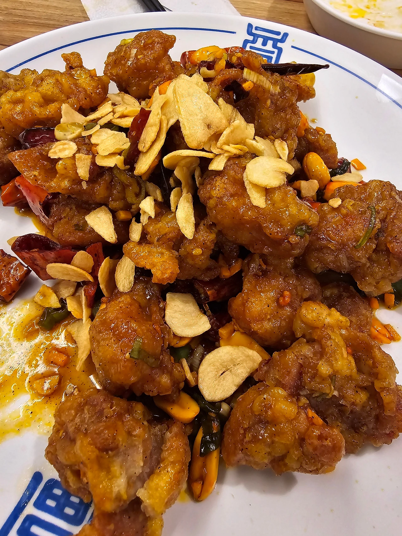 기름에서 막 튀겨져 나온 반짝거리는 윤기와 울긋불긋한 양념으로 염색된 튀김옷, 그 위에 얇게 썰린 마늘 플레이크가 뿌려져 있고 깨, 고추씨, 땅콩과 튀긴 붉은 고추.