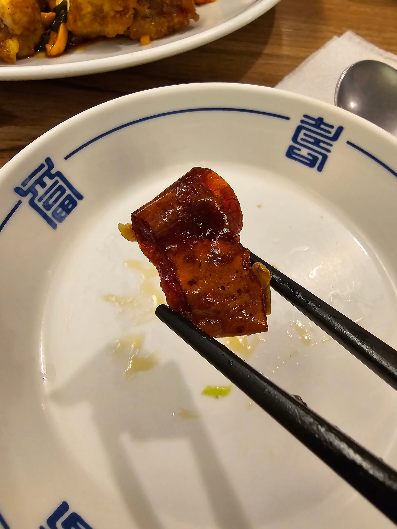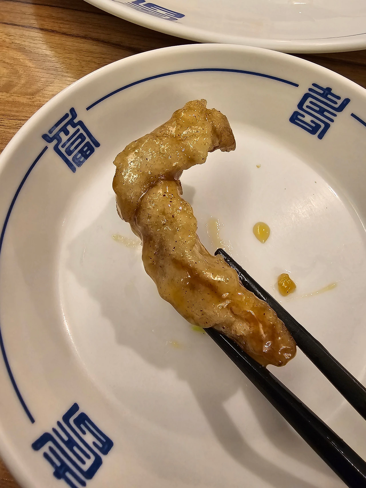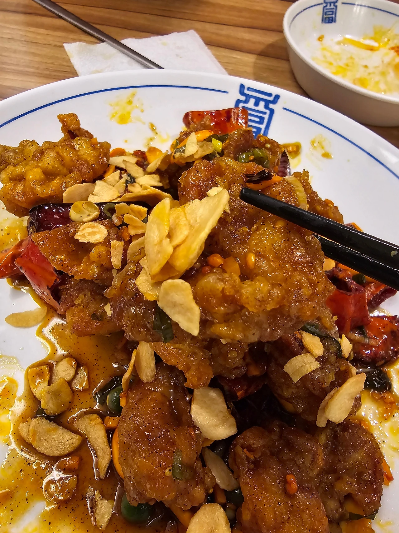 건고추를 튀겨냈으니 이것도 건고추 튀각이라면 튀각이겠지, 고추에 숨어있는 달달한 맛과 아주 약간의 매콤함이 튀김의 식감과 어울려 여기에 칭따오 한잔만 곁들이면 완벽 그 이상이라는 생각이 드는 김고로였다. 거기에 마늘 플레이크를 올려서 깐풍기 한 조각을 씹는다.