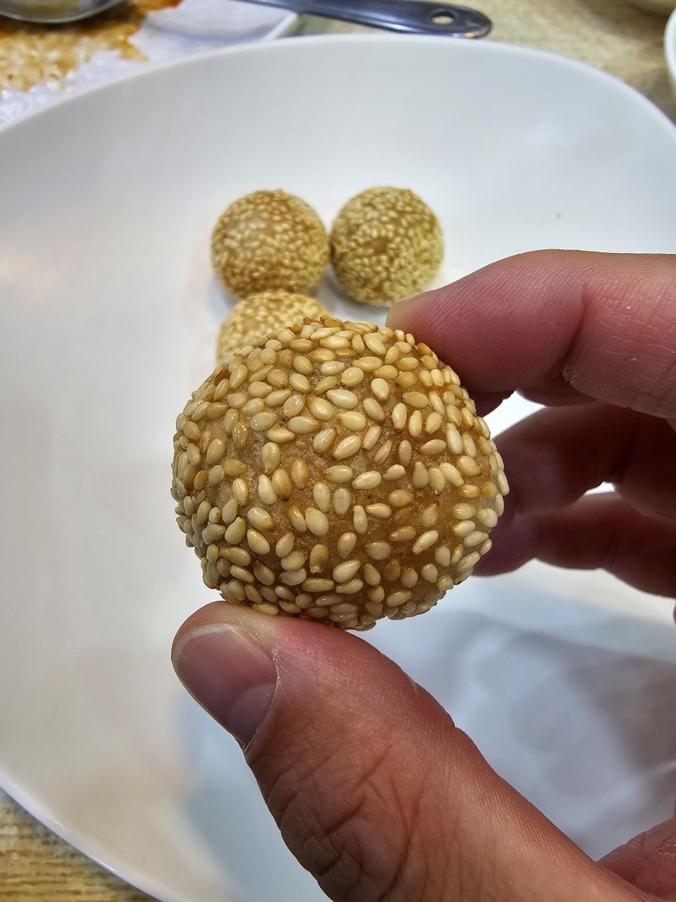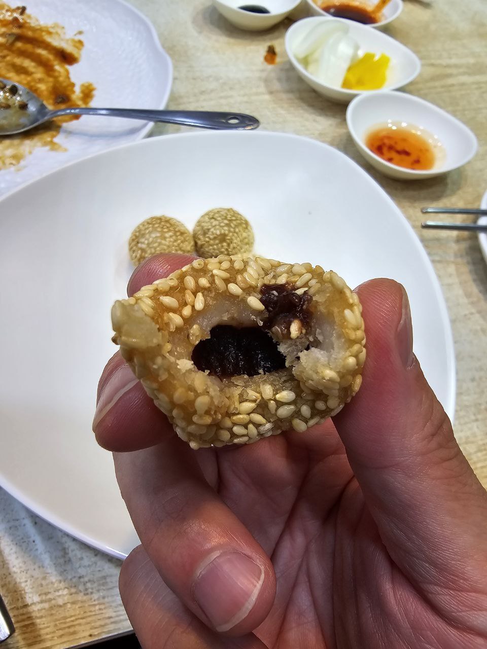 중국에 거주할 시절에도 몇 번 먹어보지 못했던 음식이다, 동글동글한 작은 찹쌀공 안에 달콤하고 비단처럼 부드러운 팥앙금이 바삭바삭한 찹쌀튀김 그리고 톡톡 터지는 깨알들이 서로 시너지 효과를 내는 식감. 오래간만에 보는 오랜 친구와 악수하는 기분인 김고로였다.