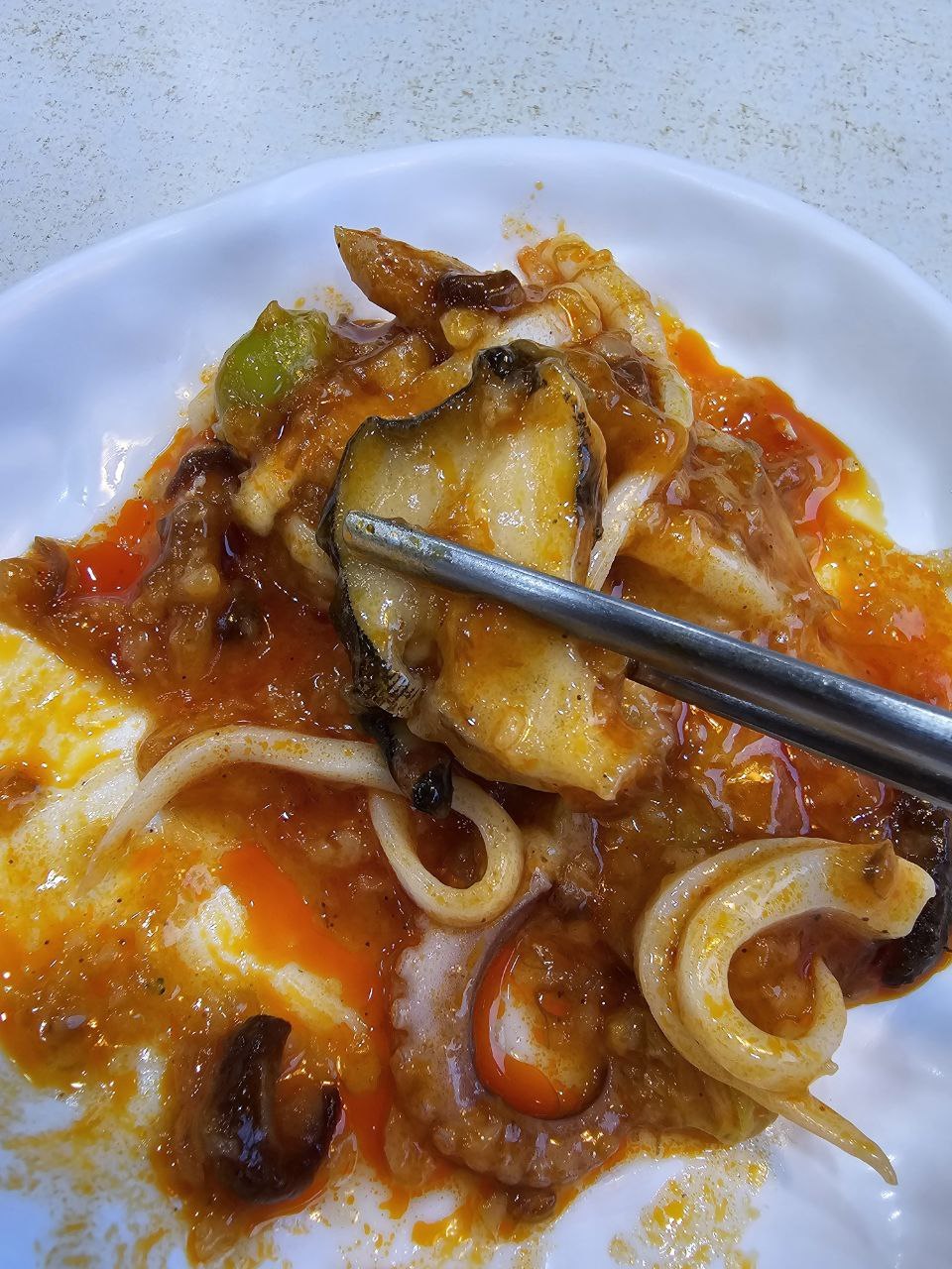 그리고 마늘이 많아서 입안에서 거슬릴 거라고 예상되던 김고로의 어리석음과는 달리 촉촉하며 끈적거려 느끼할 수도 있겠다는 표면적인 선입견을 와장창 부수는 과도할 정도로 많은 다진 마늘 덕분에 참기름과 고춧기름의 맛을 극강의 고소함으로 끌어올려 글을 쓰는 지금도 지썅지썅 팔보채가 혀를 꽉 잡아서 끌어당기던 그 맛을 상상할 수 있을 정도다. 일반적인 팔보채가 아닌 지썅지썅의 연륜이 가미된 '지썅지썅식' 팔보채다. 별다른 기대 없이 '어머니가 팔보채를 좋아하니까' 가볍게 팔보채를 주문한 김고로는 기대 이상의 만족감을 얻었다.