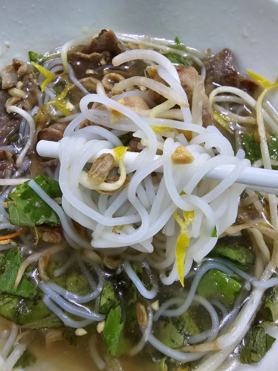 말캉거리는 쌀국수 사이로 은은하게 울려 퍼지는 단맛의 금관악들과 사각거리는 채소들의 현악, 그리고 군데군데 섞여 들어온 땅콩알갱이와 돼지고기가 함께 맞물려 펑펑 터지는 고소함의 타악이 한 그릇의 지휘자 안에서 아름다운 연주를 이어간다. 달달하고 시원한 쌀국수라서 그런지 더운 여름날에는 더욱 꿀맛이다.