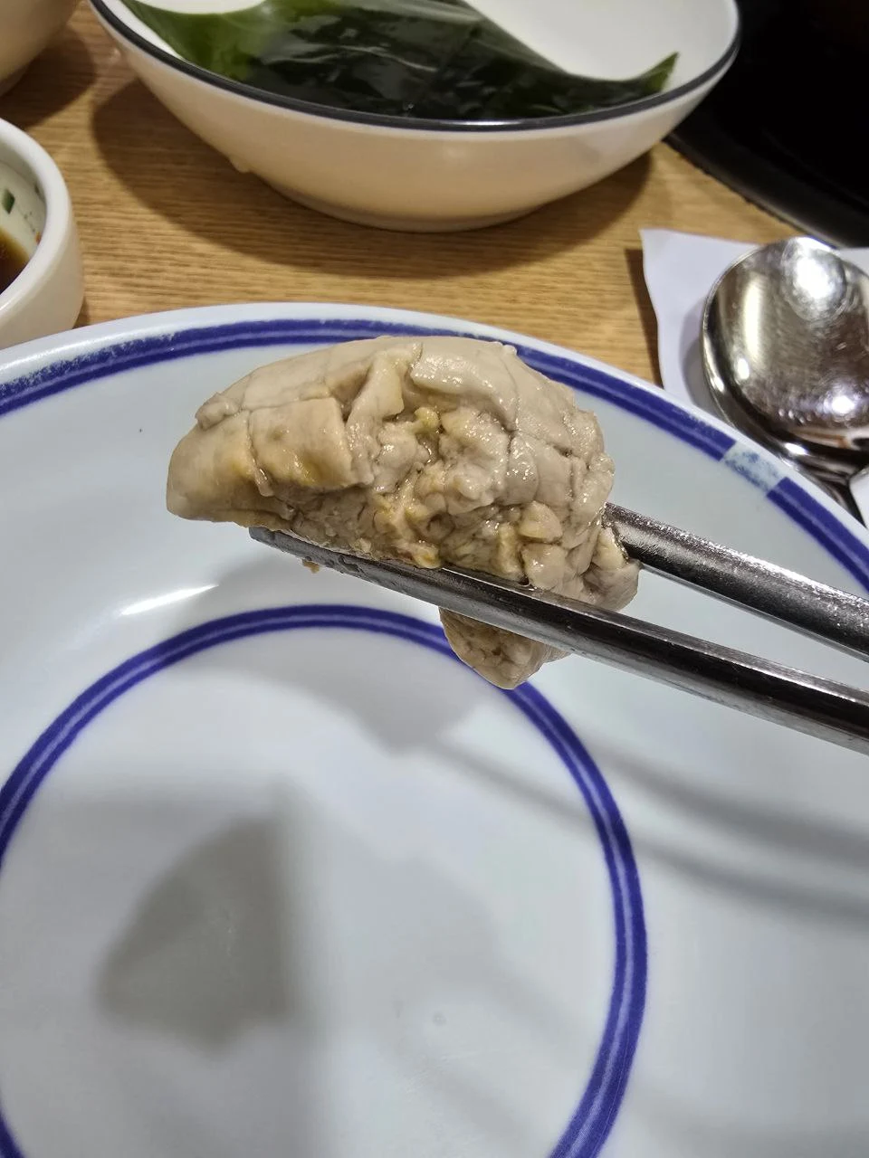 김고로는 고추냉이를 살짝 섞은 간장에 아귀 위를 콕콕, 살짝 찍어서 날름 삼켜서 씹는다. 아귀의 위는 겉으로 봐서는 잘 구워진 한우와도 같지만 입안에 들어가면 쫄깃하게 튕기는 얇은 식감이 아귀의 간과는 반전되는 맛을 준다. 쫄깃하게 씹히면 씹힐수록 위장 근육 세포 사이에서 뿜어져 나오는 진하고 깔끔한 맛이 그저 계속 씹어 먹고 싶게 만드는 맛이다. 개인적으로는 이전에 포항을 방문했을 때 먹었던 아귀의 대창보다도 맛이 훨씬 좋았다.