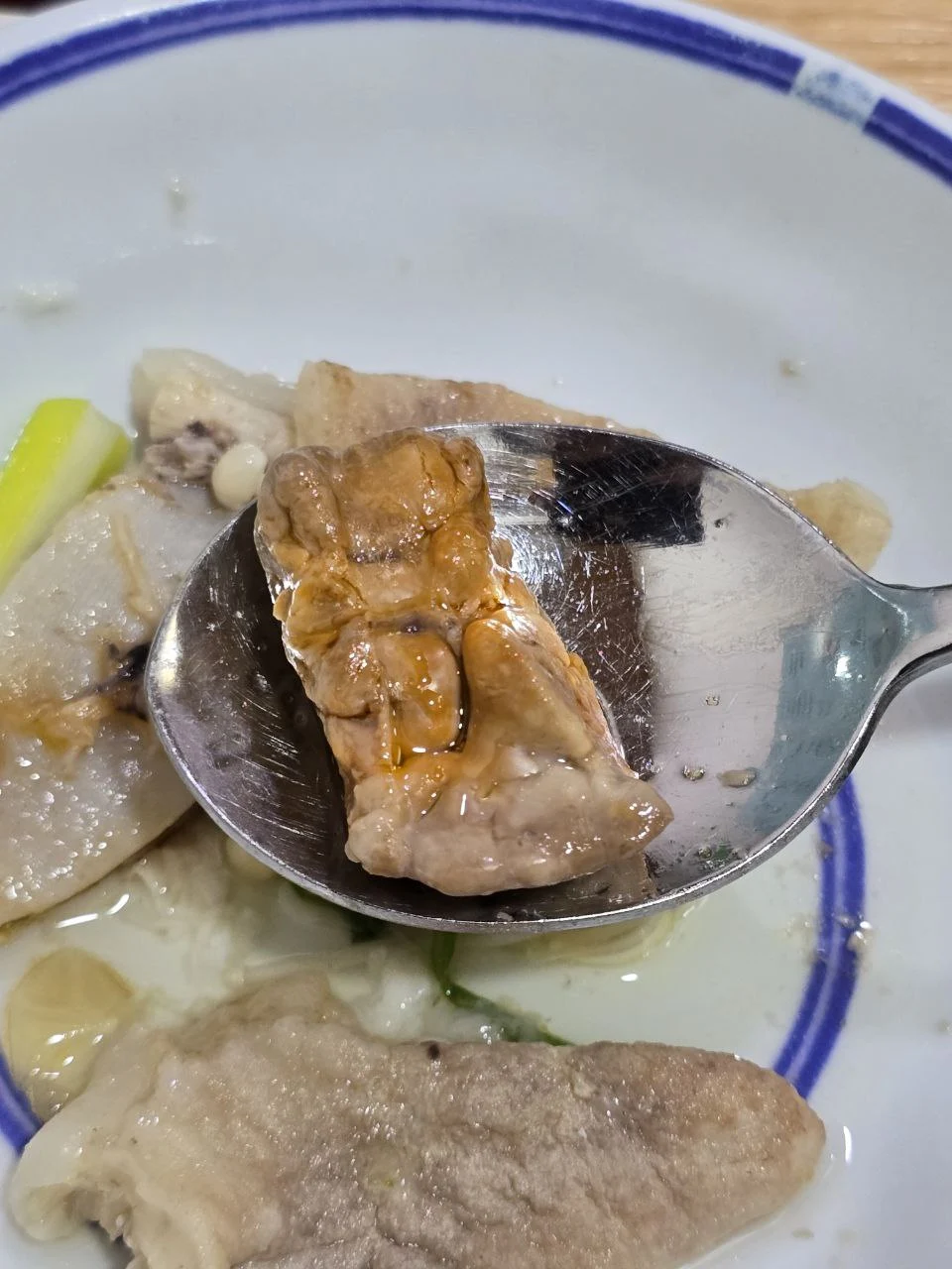 김고로는 맛이 궁금했던 아귀수육을 촉촉하게 적신 아귀 육수를 숟가락을 들어 한 입 먹는다.