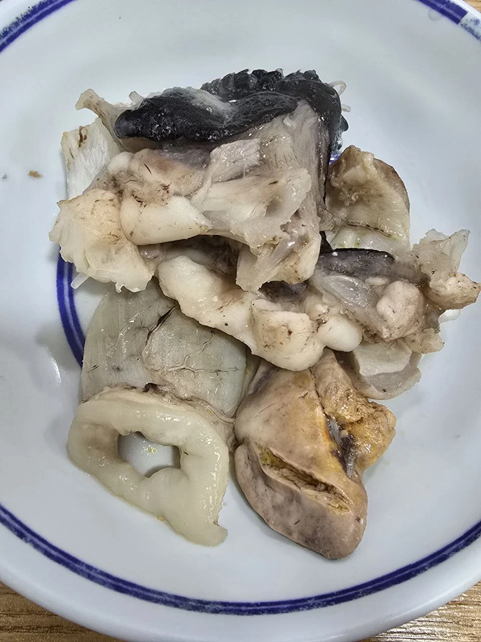 아귀 간과 위장 (좌) / 아귀 위장과 간이 좌,우로 누웠고 그 위에 아귀살이 올라가있다 (우)