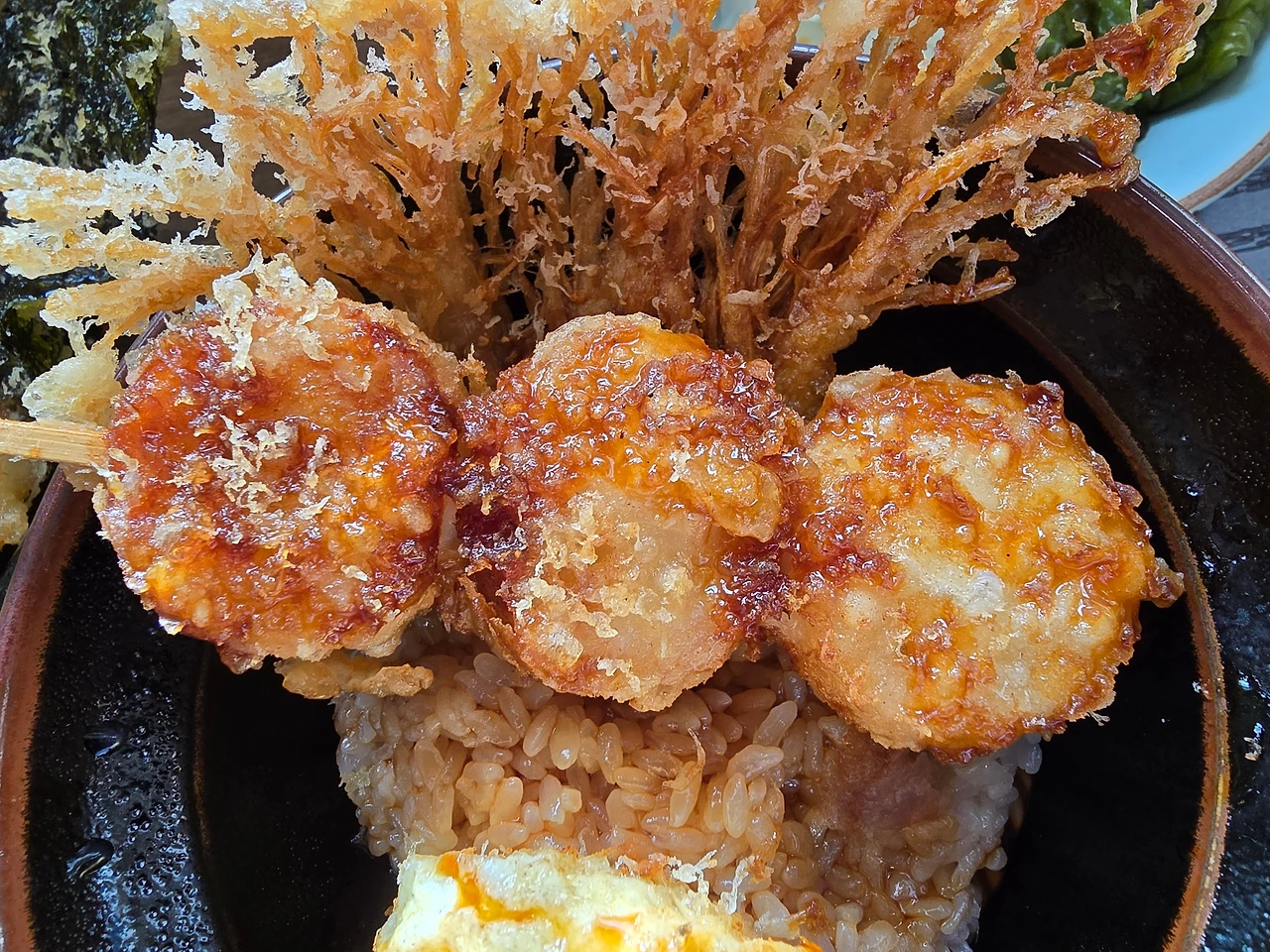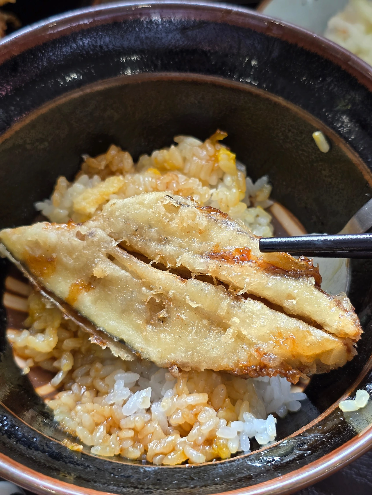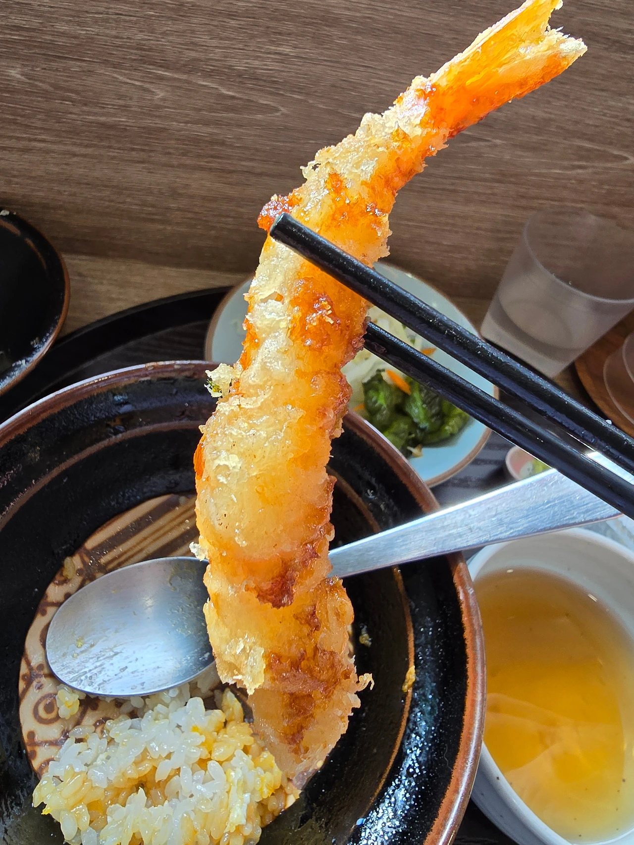 말랑말랑하고 바삭한 겉을 가진 흰자가 찢어지며 진득하게 끈적이는 노른자가 흘러내린다. 소금이나 간장 없이도 이미 적절한 간과 맛을 숨기고 있는 튀긴 반숙, 숟가락과 젓가락으로 가능한 맛있는 한입 크기로 조각을 내어 밥을 비빈다. 고슬고슬하게 지어진 밥에 익은 달걀을 얹어서 먹으니 입안에 달걀의 고소한 맛이 가득하다. 달달한 맛이 있지만 설탕처럼 달콤하기보다는 약간의 달착지근함과 고소함이 균형 잡힌 텐동 소스다. 텐동 소스가 밥에 잔뜩 묻은 부분을 먹어도 굉장히 자극적이지 않다, 조금 달콤한 물엿과도 같은 단맛에 고소하고 짭짤한 맛이 그 위를 덮는다. 심심하다고 생각될 수도 있지만 자극적인 맛도 아니고 자기주장이 강한 소스도 아니기 때문에 텐동에 올려진 튀김들에 부분적으로 묻었을 때 균형이 치우치지 않고 알맞다. 튀김만 먹다 보면 누군가에게는 약간 기름지거나 느끼할 수도 있기에, 아주 약간의 단맛과 고소함으로 즐거운 식사를 돕는다.