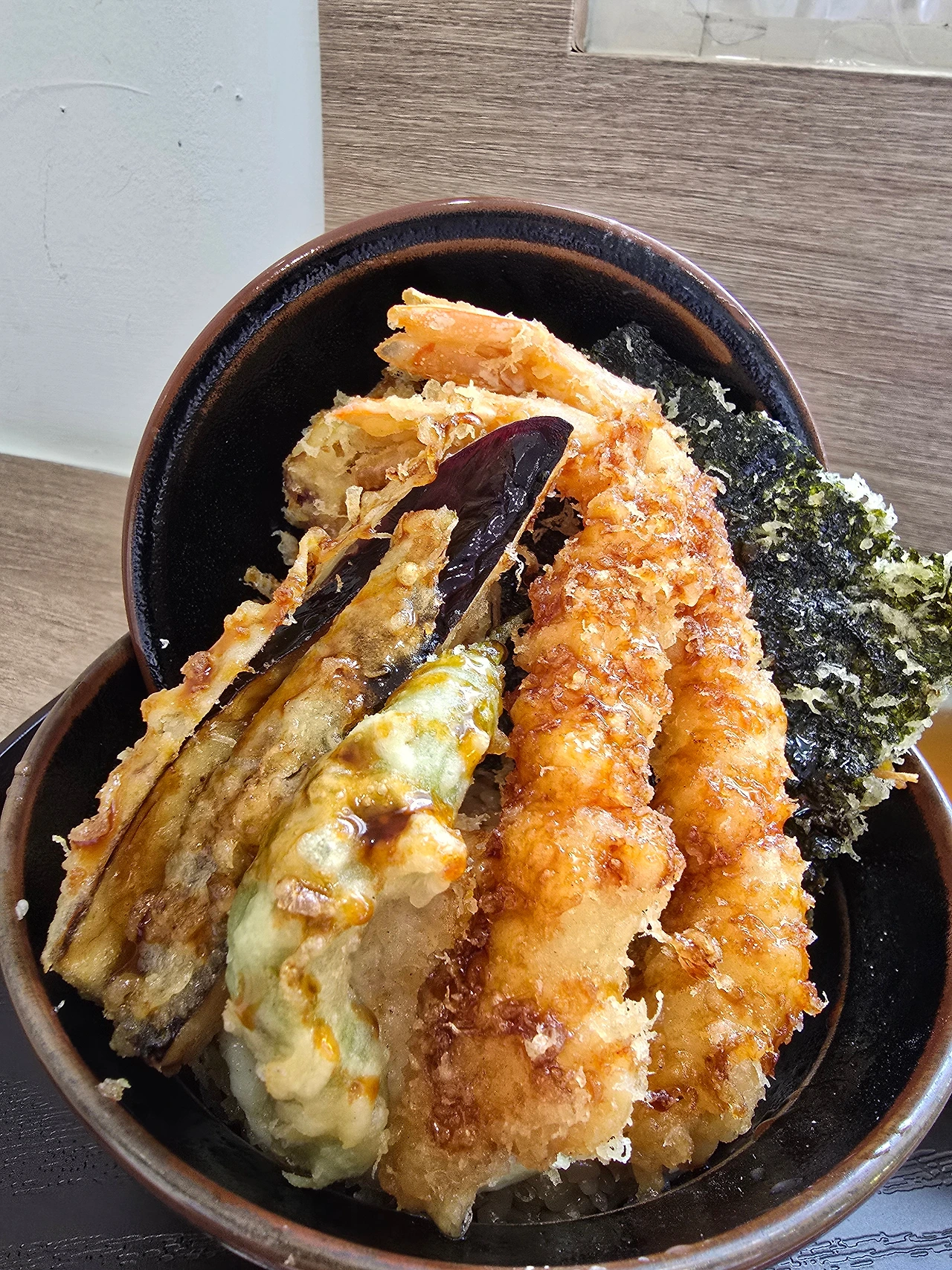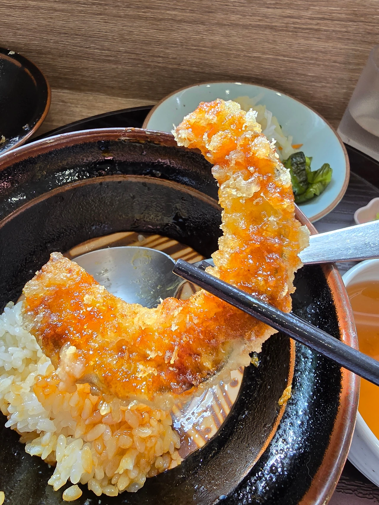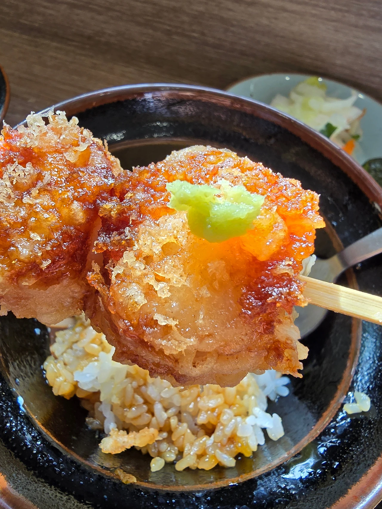 말랑말랑하고 바삭한 겉을 가진 흰자가 찢어지며 진득하게 끈적이는 노른자가 흘러내린다. 소금이나 간장 없이도 이미 적절한 간과 맛을 숨기고 있는 튀긴 반숙, 숟가락과 젓가락으로 가능한 맛있는 한입 크기로 조각을 내어 밥을 비빈다. 고슬고슬하게 지어진 밥에 익은 달걀을 얹어서 먹으니 입안에 달걀의 고소한 맛이 가득하다. 달달한 맛이 있지만 설탕처럼 달콤하기보다는 약간의 달착지근함과 고소함이 균형 잡힌 텐동 소스다. 텐동 소스가 밥에 잔뜩 묻은 부분을 먹어도 굉장히 자극적이지 않다, 조금 달콤한 물엿과도 같은 단맛에 고소하고 짭짤한 맛이 그 위를 덮는다. 심심하다고 생각될 수도 있지만 자극적인 맛도 아니고 자기주장이 강한 소스도 아니기 때문에 텐동에 올려진 튀김들에 부분적으로 묻었을 때 균형이 치우치지 않고 알맞다. 튀김만 먹다 보면 누군가에게는 약간 기름지거나 느끼할 수도 있기에, 아주 약간의 단맛과 고소함으로 즐거운 식사를 돕는다.