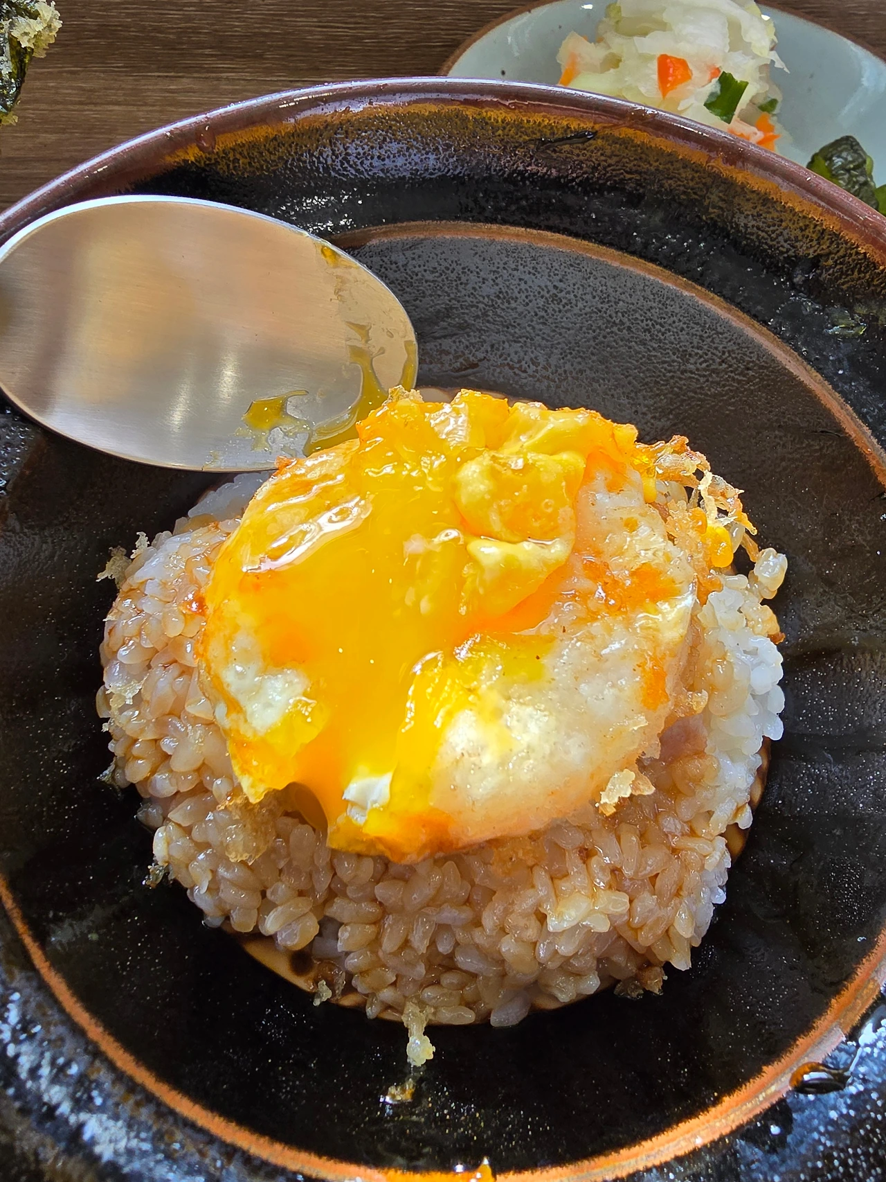 "한국에 간장과 참기름 그리고 반숙으로 익은 달걀로 비벼 먹는 '간장달걀밥'이 있다면 튀김덮밥 집에는 이게 제맛이지."