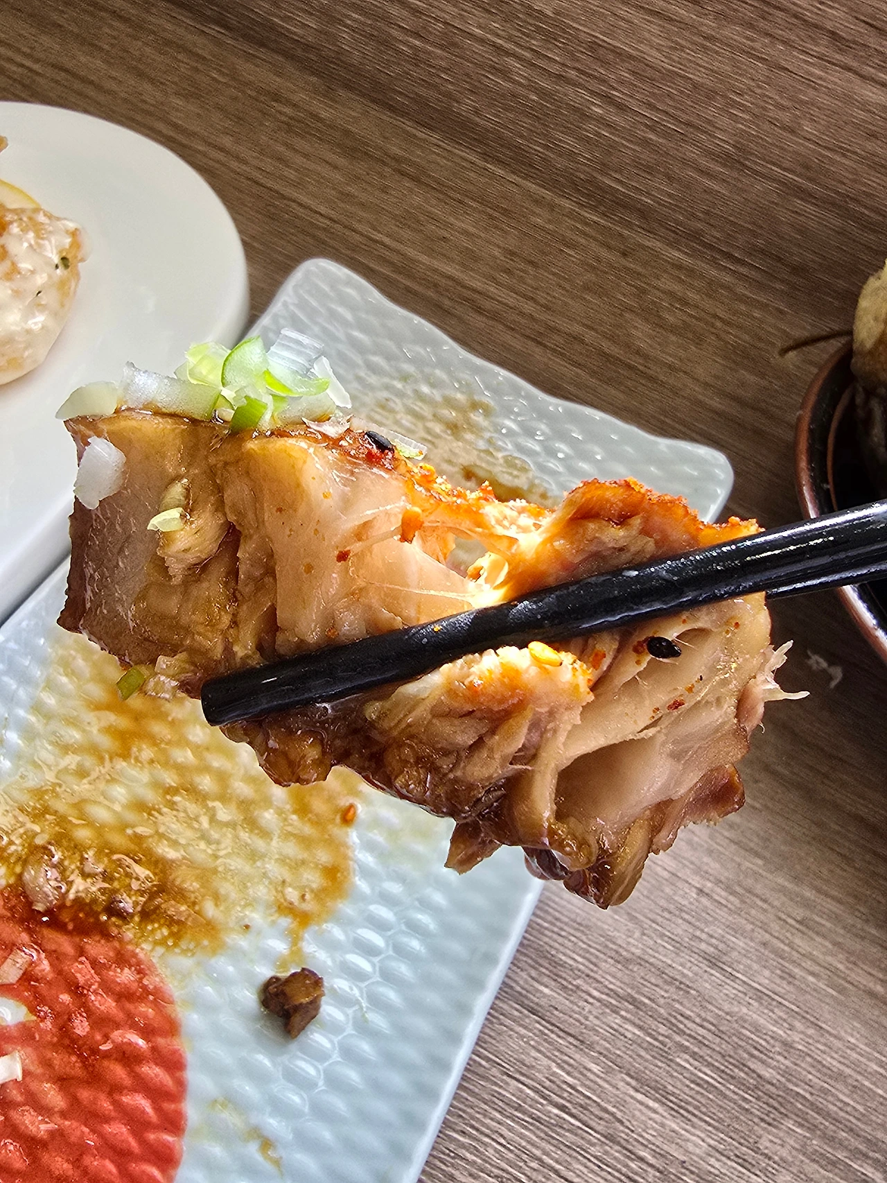 얇은 튀김옷은 금방 부서지고 관자가 하얀 속살을 비추인다, 바다의 향과 조개 특유의 향이 맞물리며 입안에 퍼지고 달착지근한 소스가 혀를 감싸 안는다, 고기처럼 쫄깃하게 씹히는 관자 위로 알싸한 고추냉이의 매운맛이 훅 튀어 올라오고 다시 조개의 향을 풍기며 사라진다.