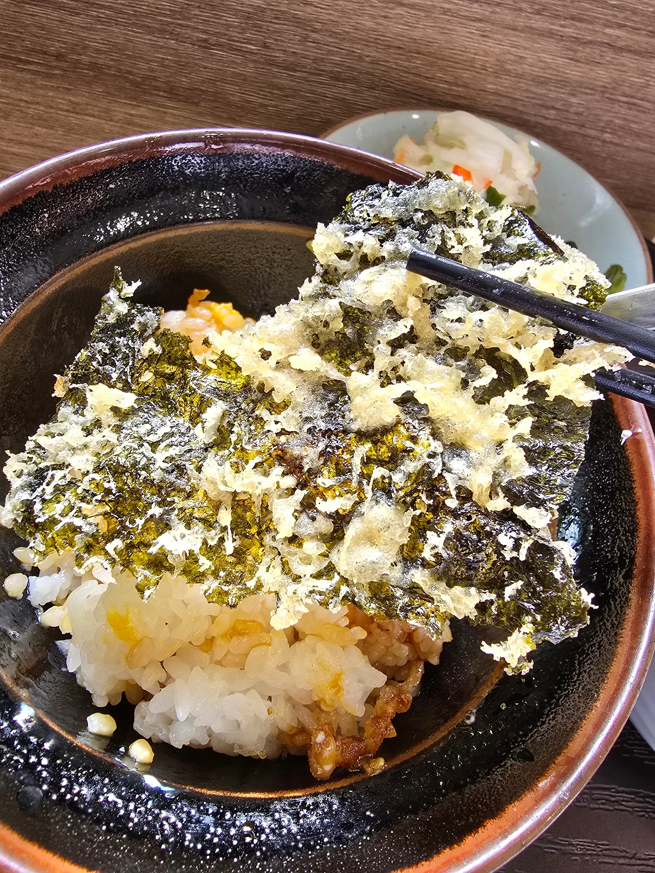 김고로는 처음 먹을 튀김으로 '김튀김'을 골랐다. 여러 튀김들 중에서 바삭한 식감은 제일이지만 김의 맛 자체는 약하게 느껴지기에, 제일 심심하지만 바삭한 김튀김을 고른다. 그리고 다른 튀김들을 먹기 전에 텐동에 올라간 튀김들의 튀김옷이 어떤 종류인지 판단하기도 용이하다.