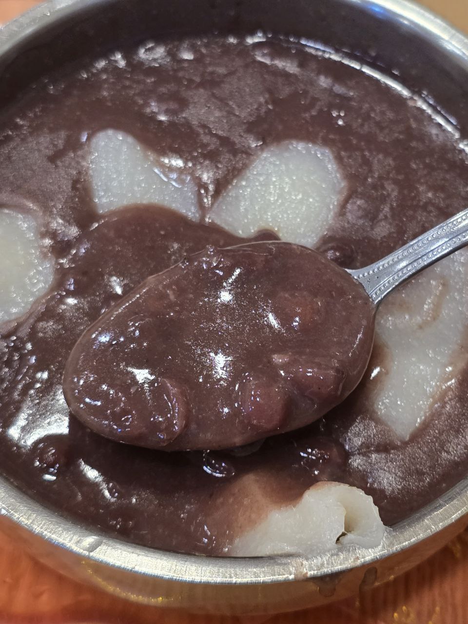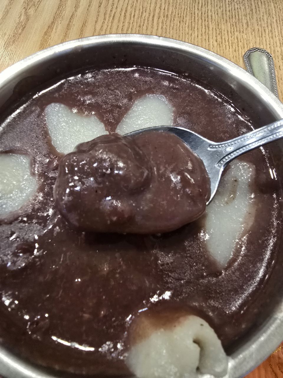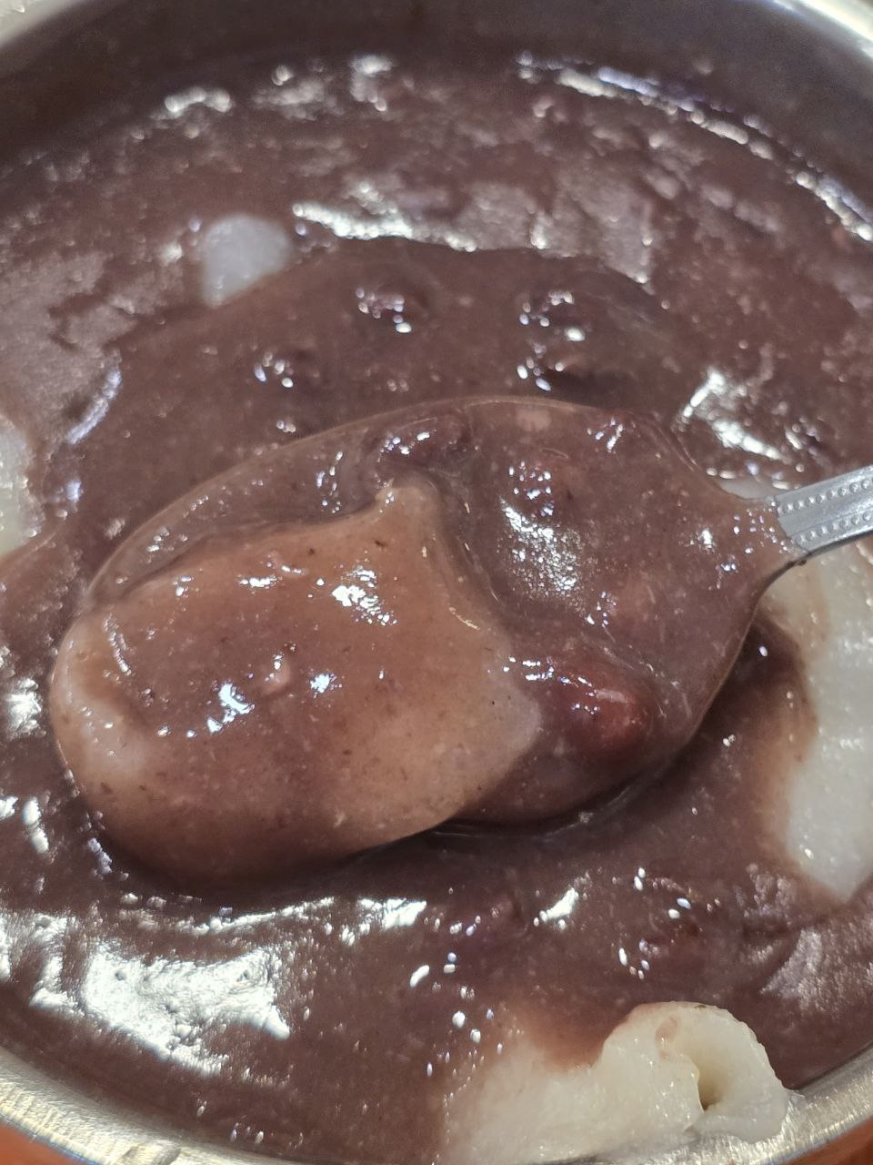 해물육수에 풍덩 담긴 수제비와는 완전히 다른 식감이다, 입안의 잇몸과 치아에 쩍쩍 달라붙는 느낌이 들도록 늘어나는 찹쌀떡 반죽을 달콤한 팥고물에 푹 담가서 먹는 맛. 떡에는 거의 단맛이 배어있지 않고 심심한 맛이고 단팥죽이 쉽게 스며들고 많이 묻어서 팥떡인데 매우 촉촉한 팥떡을 씹는 기분이다. 거기다가 싱거운 떡의 맛이 단팥의 달콤함과 적절한 균형을 이루면서 단팥죽이 점점 사라지는 것이 아쉬울 정도였다.