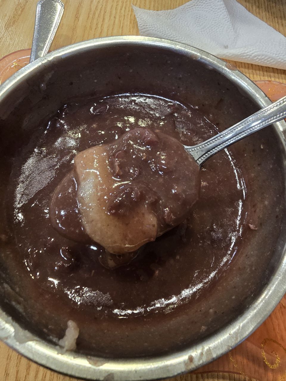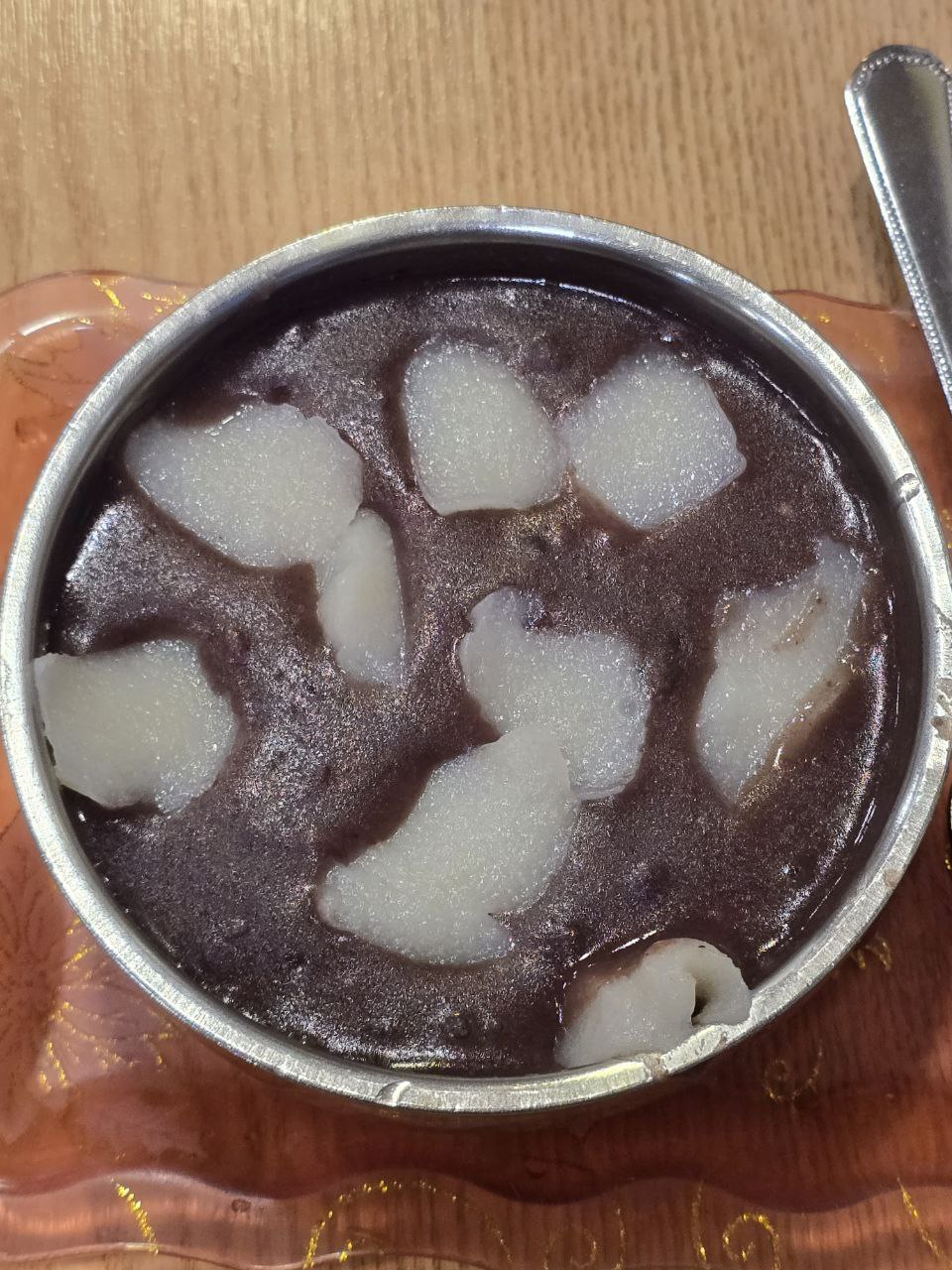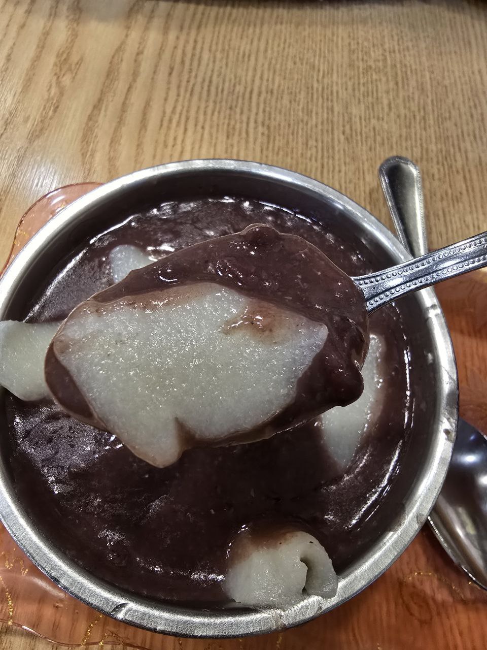 해물육수에 풍덩 담긴 수제비와는 완전히 다른 식감이다, 입안의 잇몸과 치아에 쩍쩍 달라붙는 느낌이 들도록 늘어나는 찹쌀떡 반죽을 달콤한 팥고물에 푹 담가서 먹는 맛. 떡에는 거의 단맛이 배어있지 않고 심심한 맛이고 단팥죽이 쉽게 스며들고 많이 묻어서 팥떡인데 매우 촉촉한 팥떡을 씹는 기분이다. 거기다가 싱거운 떡의 맛이 단팥의 달콤함과 적절한 균형을 이루면서 단팥죽이 점점 사라지는 것이 아쉬울 정도였다.
