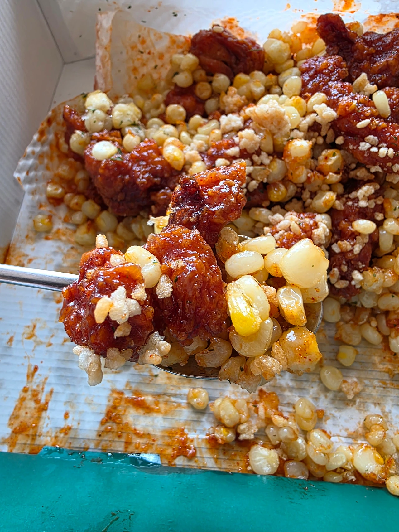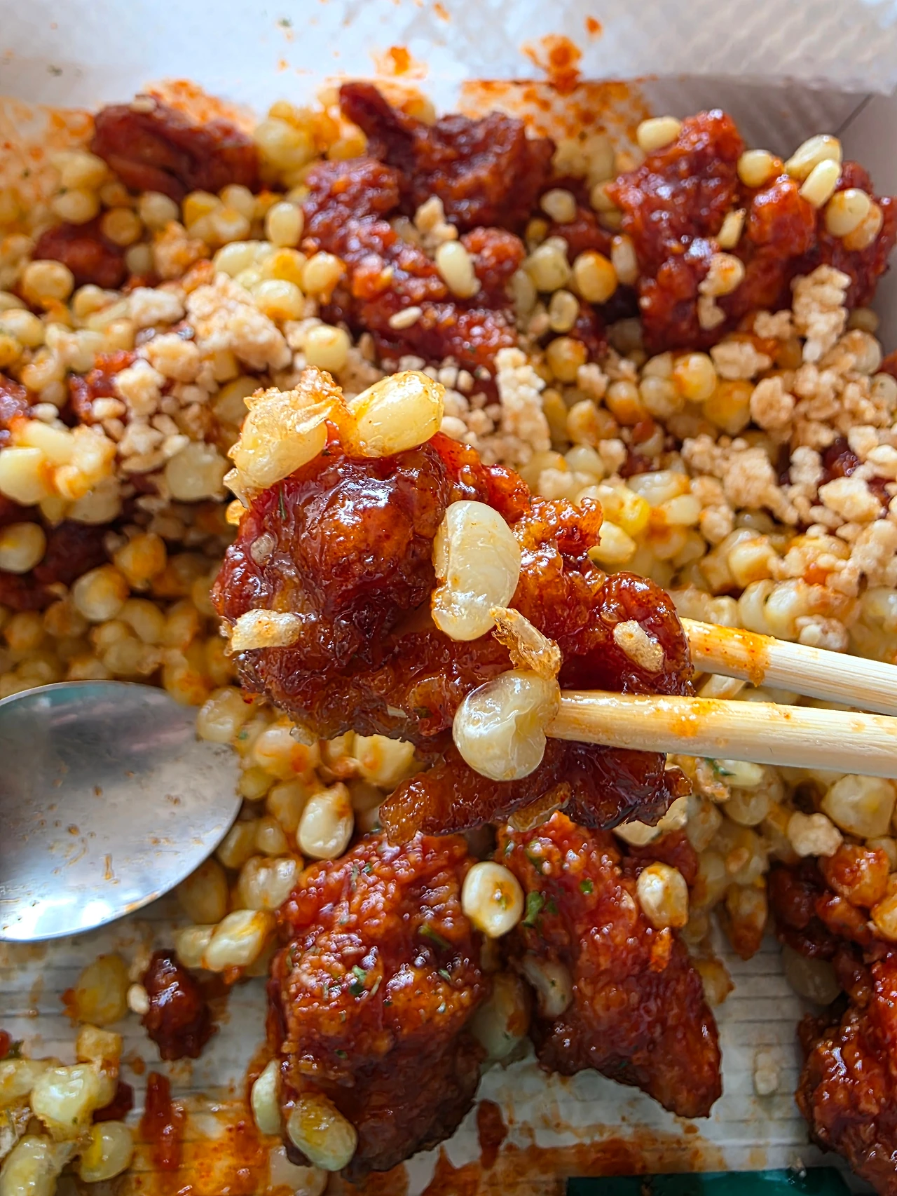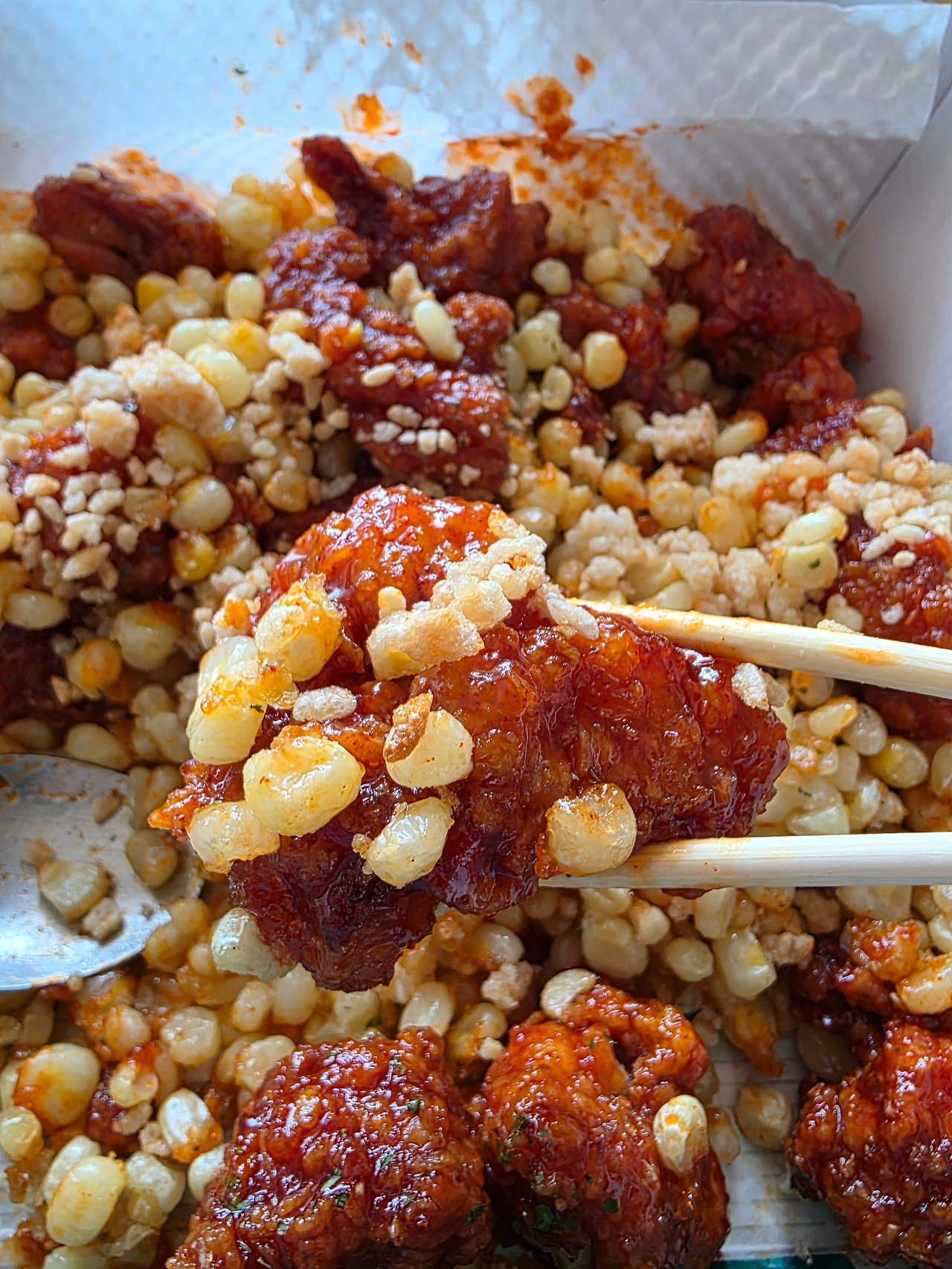 수저를 이용해 닭강정 위에 찰옥수수와 누룽지 가루를 잔뜩 올려 입안으로 가져간다. 찰옥수수 알 하나하나 굴러 떨어져 놓칠세라 조심스럽게 숟가락으로 닭강정 먹기는 처음이다.