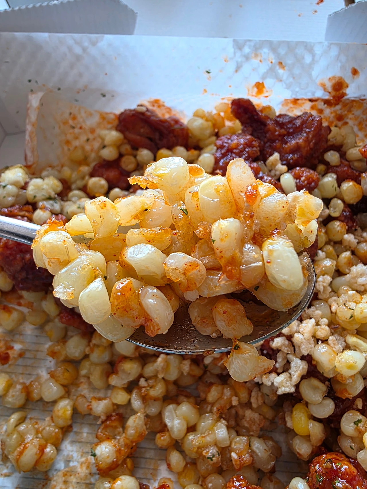김고로는 이어서 숟가락을 들고 닭강정 양념으로 범벅된 찰옥수수를 듬뿍 퍼올린다.