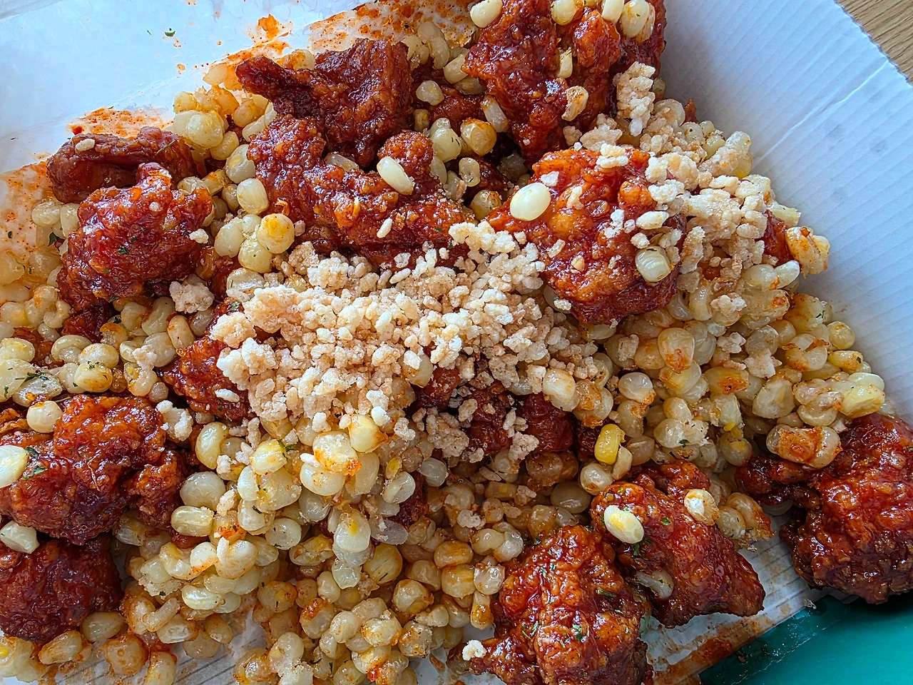 강릉닭강정의 특징이라면 고명으로 누룽지와 찰옥수수를 위에 올려준다. 바삭한 닭강정 위에 또 바삭한 누룽지와 쫀득한 옥수수를 올려야겠다는 생각을 누가 했는지 몰라도 천재가 틀림없다. 상상만으로도 훌륭한 식감 조합.