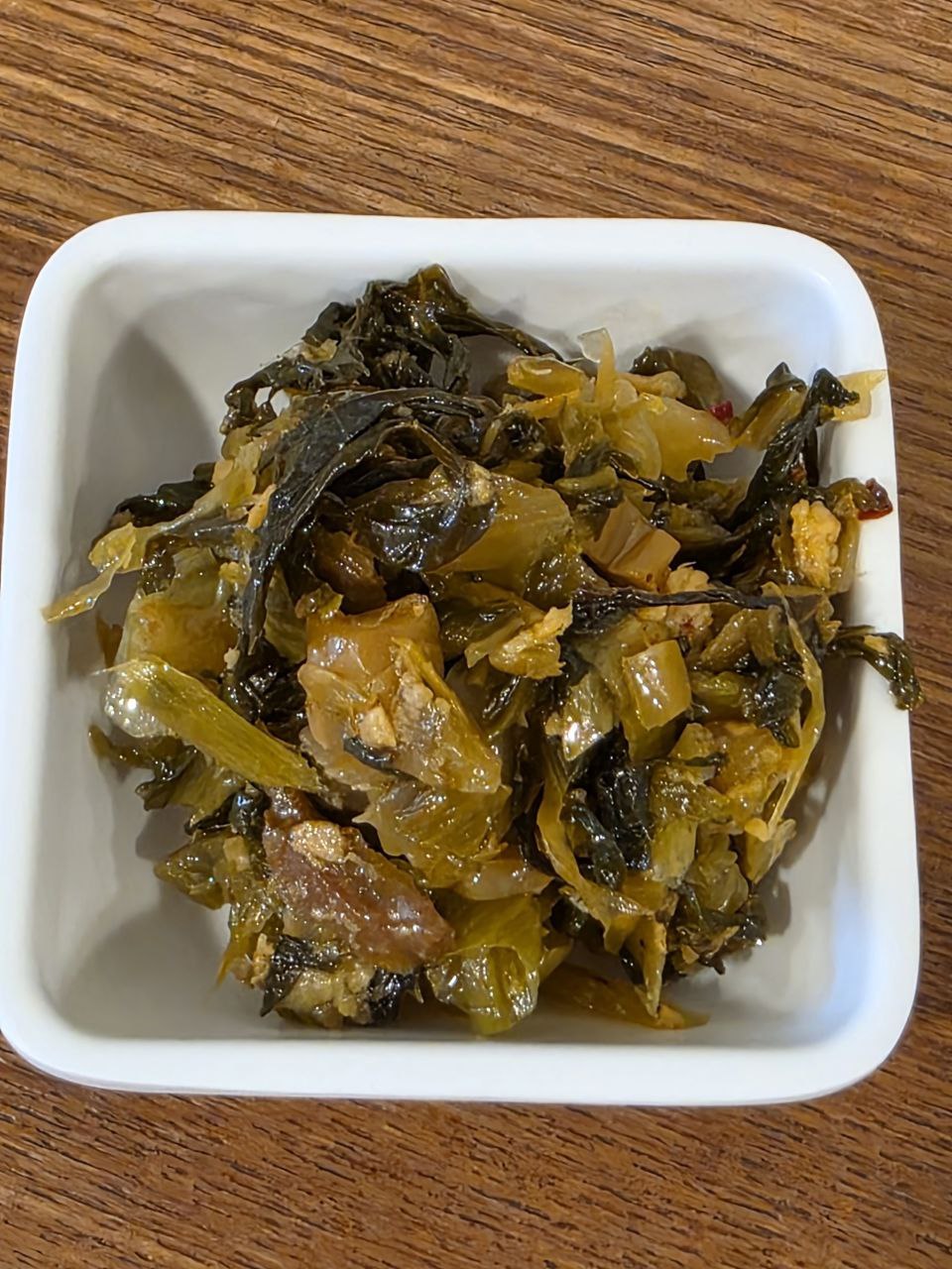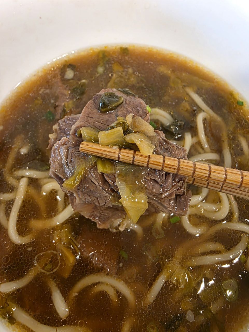 새콤하고 고소하며 짭짤한 양념이 사각거리는 갓에서 뿜어져 나온다. 국물에 넣고서 다시 국물을 마시니 쏸차이에서 우러나온 양념 덕분에 깔끔한 감칠맛으로 국물이 변한다. 거기에 이전에 없던 아삭한 채소의 식감까지 더해져 3인조 밴드였던 우육면이 이제는 실내악 쿼텟으로 변한다.