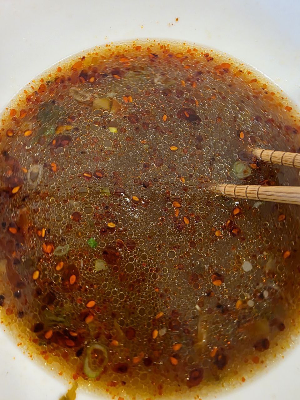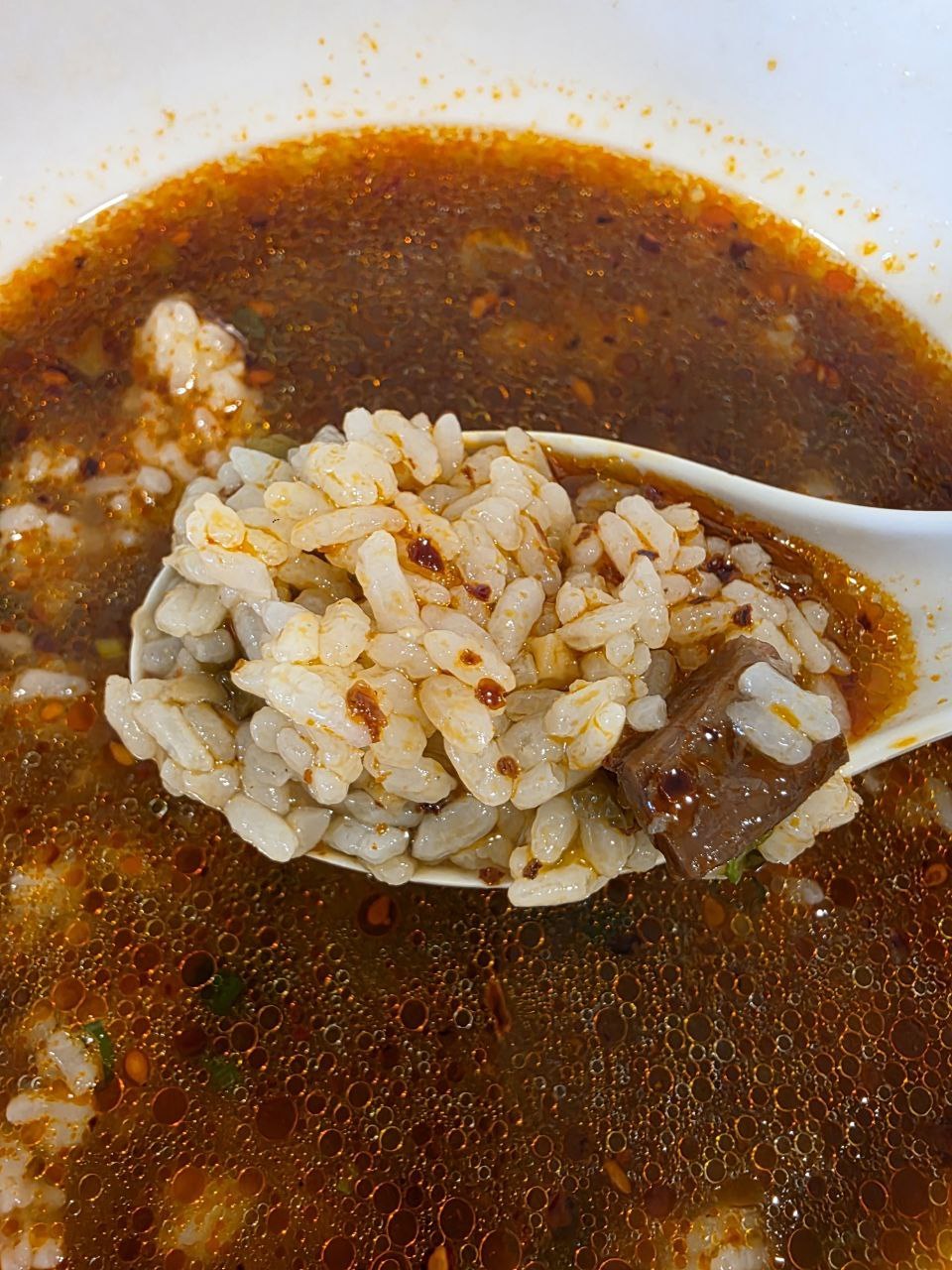고슬고슬한 밥알 사이로 아삭한 갓이 씹히고 매콤한 고춧기름과 고추씨, 고추조각이 코로 올라오는 중국식 고춧기름의 매캐함이 살짝 섞인 독특한 매콤함과 함께 아작거리며 더 작은 조각과 가루들로 부스러진다. 그렇게 정신없이 우육'국밥'을 퍼먹다 보니 내 그릇은 어느새 텅 비었다.