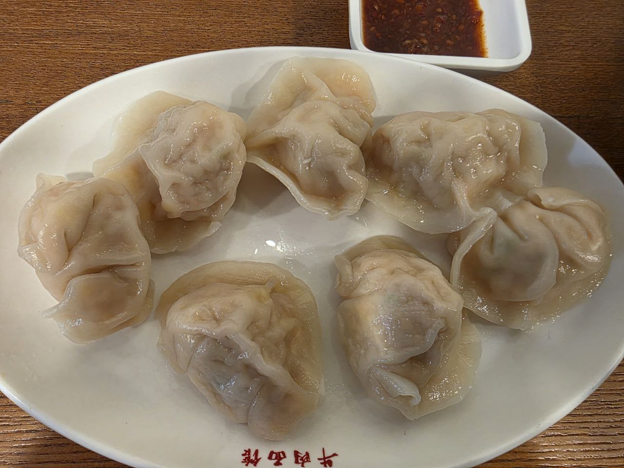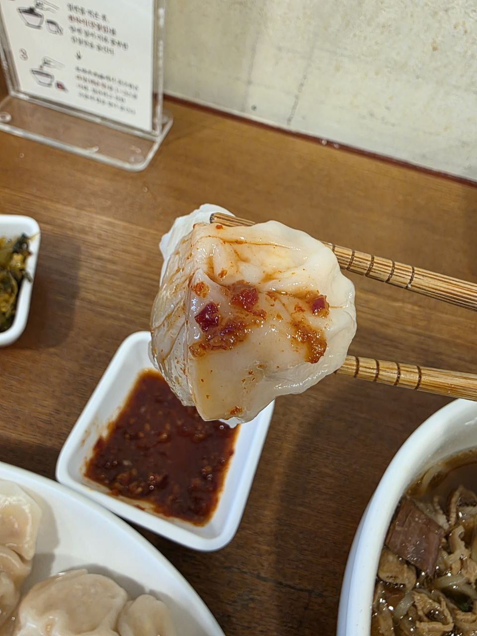 가게의 직원은 8개의 옅은 핑크빛이 감도는 긴 타원형의 수교자 그릇 옆에 시큼하고 매콤해 보이는 만두장을 내려놓고 그 옆에는 우육면을 살포시 내려놓으며 다시 자신의 자리로 돌아간다.