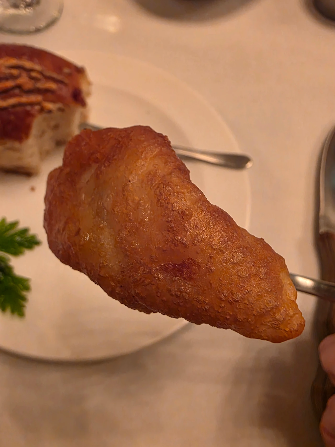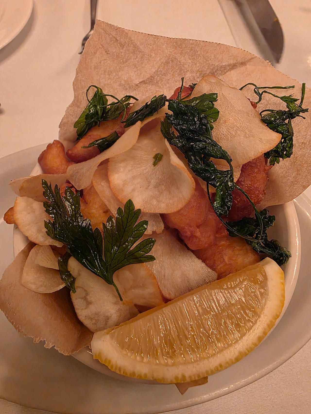 사이드로 나온 음식들 중 김고로가 사랑한 한 접시는 피시 앤 칩스. 전통적인 통으로, 두 겹의 튀김옷을 입혀 나오는 방식은 아니지만 고급 어종을 사용하셨는지 그 속살이 솜사탕과 마시멜로처럼 푹신하고 생선의 살결이 쫄깃하게 씹히는 식감이 김고로의 손과 입을 바쁘게 만들었다. 겉은 부드러운 과자처럼 바삭했기에 식감의 대조가 훌륭. 곁들여진 바삭하고 단단하지만 담백한 카사바 칩과 일본의 깻잎이라 부르는 차조기 튀김의 독특한 허브향이 기름진 맛이 두각 될 수 있는 튀긴 생선살에 기분 좋은 변화구를 던지며 매력적인 삼진 아웃의 조화.