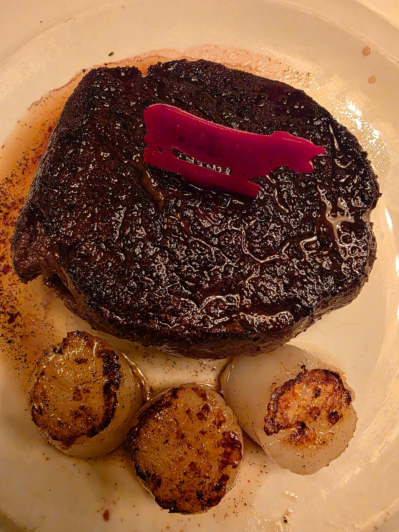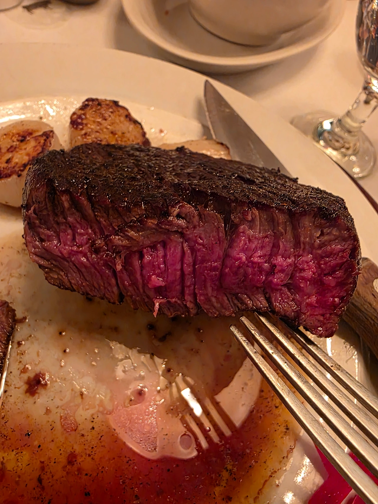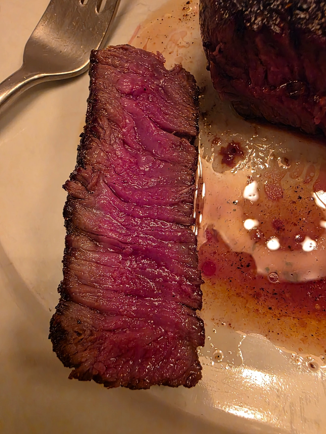 명화의 밑그림 스케치를 연필로 먼저 대충 하듯, 스테이크의 모양을 따라서 기다란 직사각형의 적갈색 시어링 선이 그어진 내부에서, 레어로 익은 안심이 생명력 가득한 붉음을 울컥 인다.