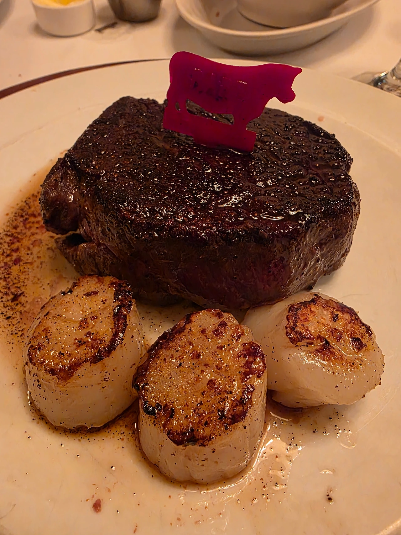 그렇게 앞서 나오는 전채 요리로 혀와 위장에 부릉부릉 시동을 걸다 보니 적절한 시점에 겉면이 아직도 지글지글거리는 듯한 짙은 색상의 거대한 고깃덩어리들이 등장한다. 가운데에 반듯하고 매끄러운 하얗고 둥근 접시 위에 당당히 놓인 큰 한우 안심. 곁에 살짝 그을려지듯 구워진 갖은 채소들과 앙증맞게 소고기의 곁을 지키는-짧은 시간 내에 김고로의 입안으로 사라질-가리비 삼 형제.