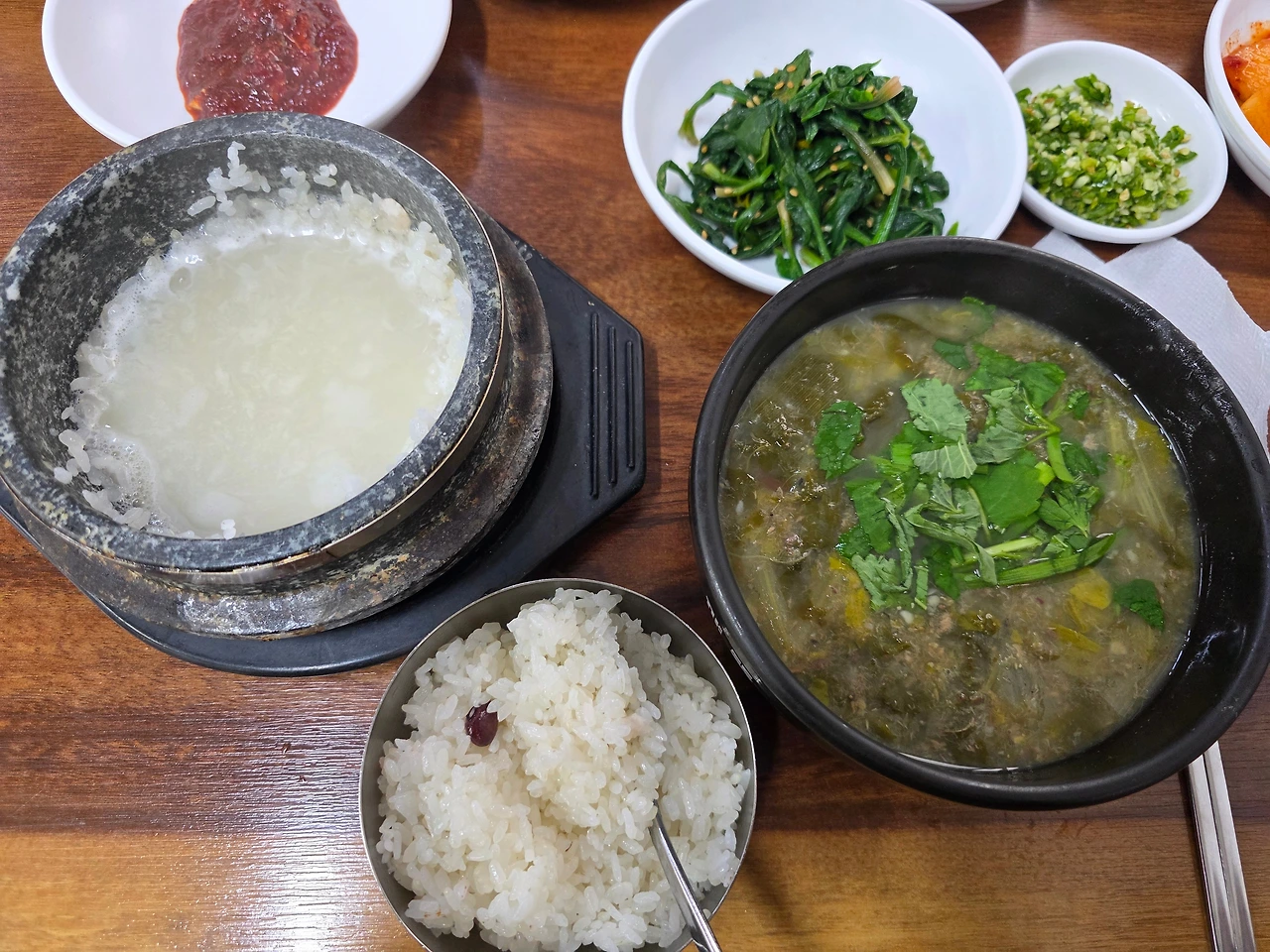 그렇게 한참을 기다렸을까, 드르륵거리는 서빙용 카트에 밑반찬들과 돌솥밥, 추어탕이 모락모락 김을 뿜으며 등장한다. 밑반찬은 경상도 지역에서 '섬초'라고 부르는 시금치를 비롯 고추장아찌, 가자미조림, 김치, 건새우마늘종볶음 등이 나와 훌륭한 전채 요리 역할을 한다. 밑반찬들이 제법 맛이 좋아서 입맛 돋우기 딱 좋다는 생각을 하는 김고로.