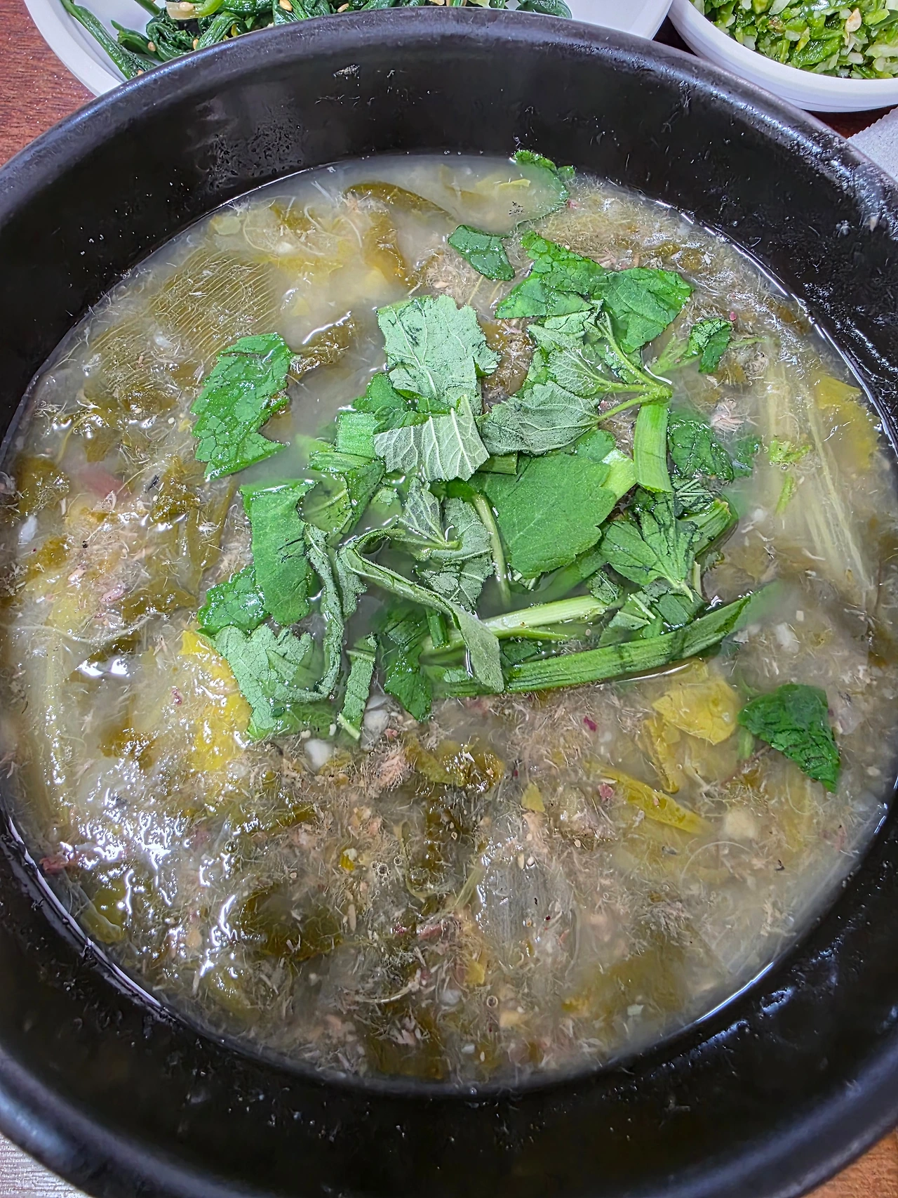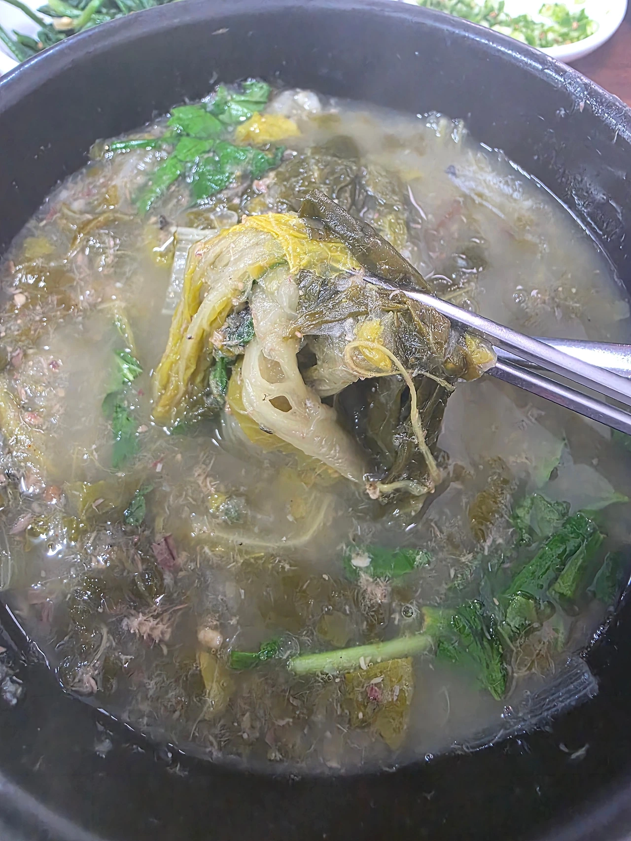 '와, 이 방아잎의 시큼한 냄새가 경상도식 추어탕의 킥이구나. 누군가에게는 비릴 수도 있는 미미한 추어의 맛을 깔끔하게 정리하는군.'