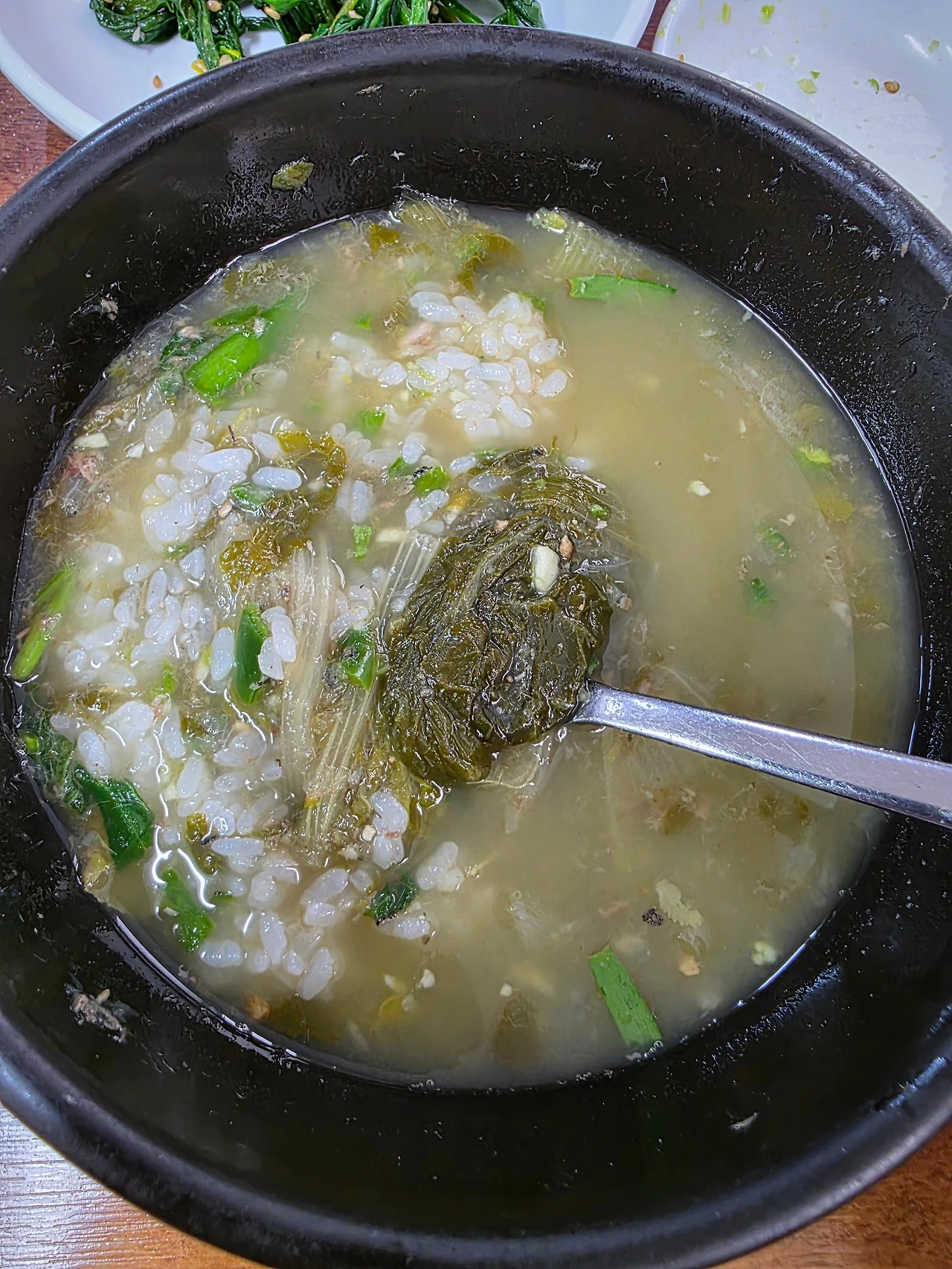 아들과 며느리에게 방아잎을 휙휙 집어서 추어탕 뚝배기 안에 던지신다. 돌솥밥은 잘 익은 (큰 콩이 살짝 들어간) 쌀밥을 퍼서 스테인리스 공기에 담고, 돌솥에는 숭늉을 넣어서 눌은밥을 누룽지로 우려낸다.