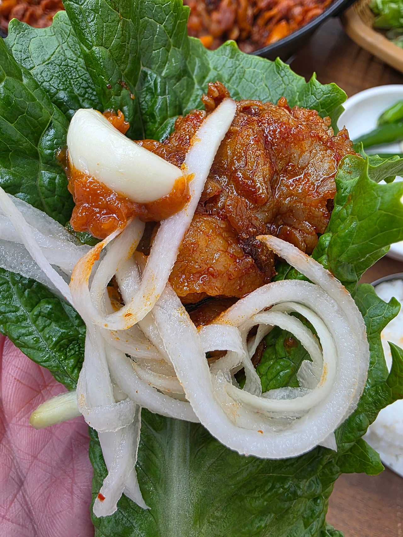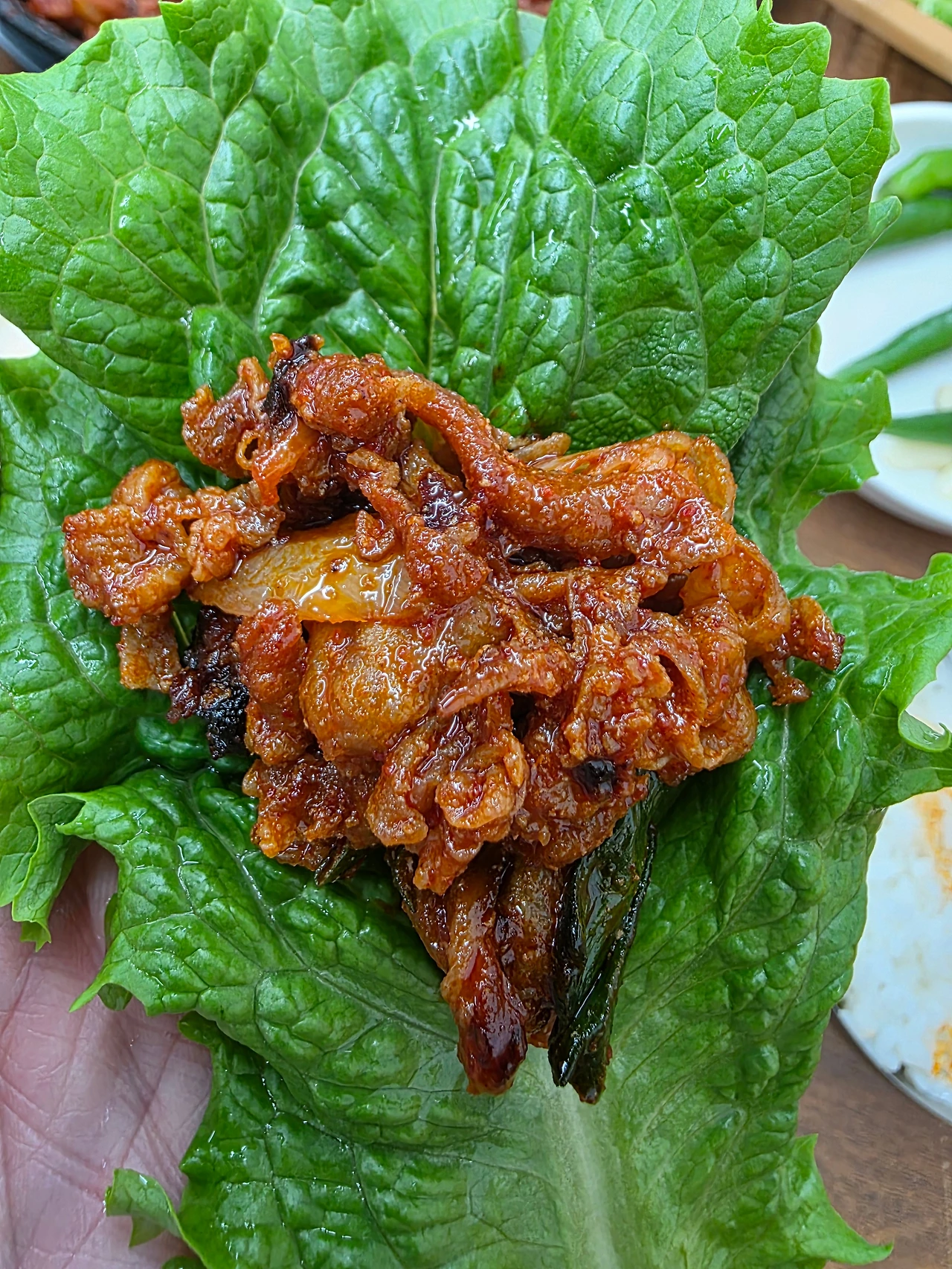 쌈추의 심심한 사각함에 새콤한 무생채가 매콤 달콤한 고추장맛의 얇은 돼지고기와 어울려 사각거리며 색다른 식감을 뽐낸다. 알싸한 마늘이 입안을 깔끔하게 정리하며 사라진다. 김고로는 미역줄기를 좋아하지 않기에 쌈에 포함하지 않았지만, 조금 더 상큼하고 색다른 식감을 더해주지 않았을까.