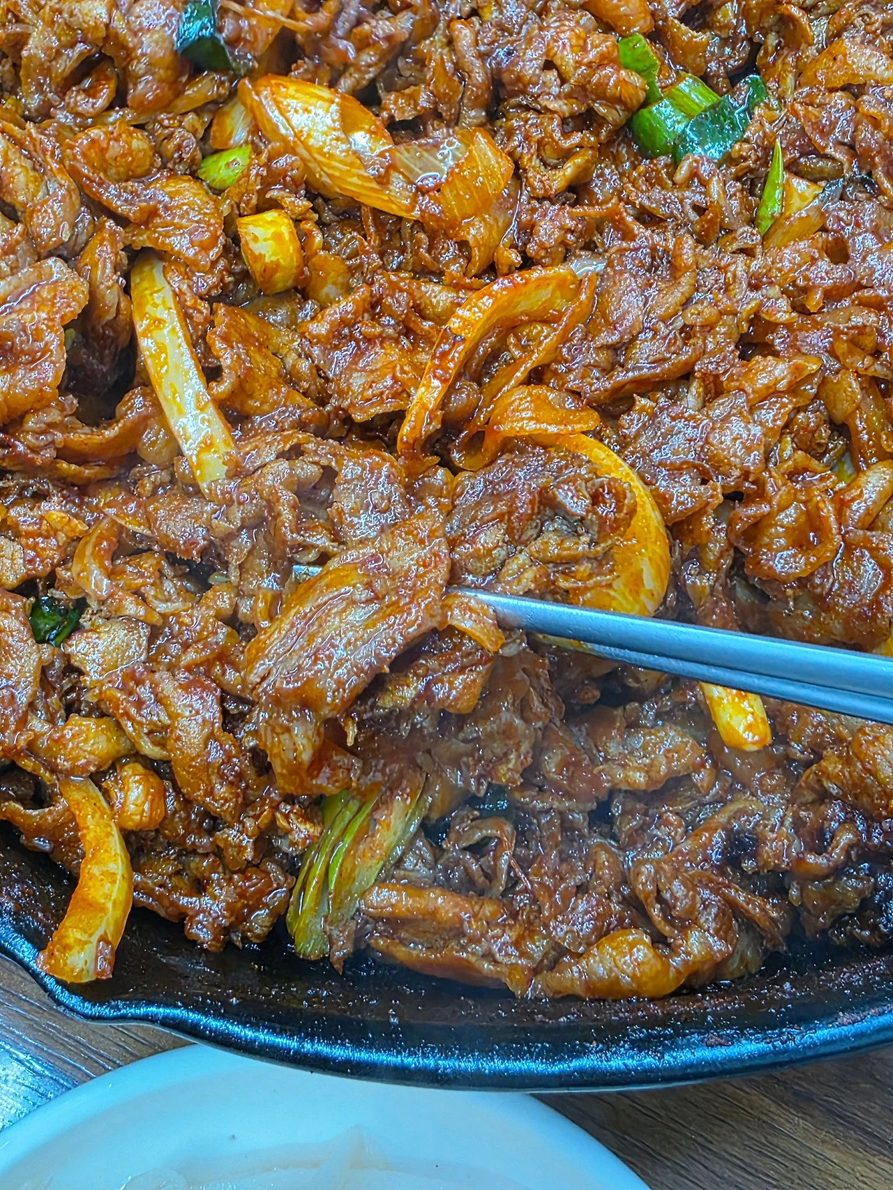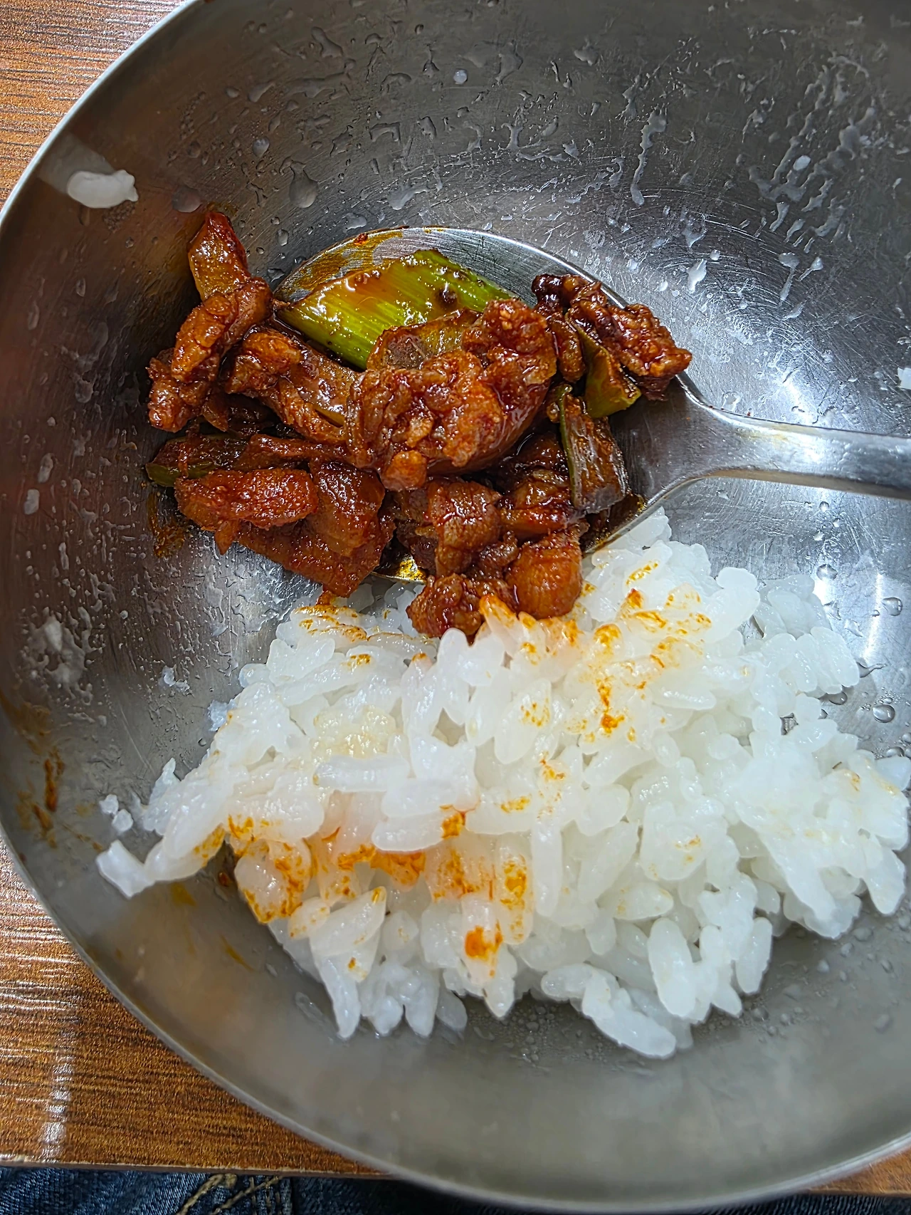 붉고 투명하여, 형광등 불빛에 반사되어 영롱하게 빛나는 기름에 굴려진 파와 양파도 집어서 씹어본다. 사각거리며 아작아작거리는 채소의 식감이 달콤하다, 그 채소에서 묻어 나오는 고깃기름의 감칠맛도 매력적.