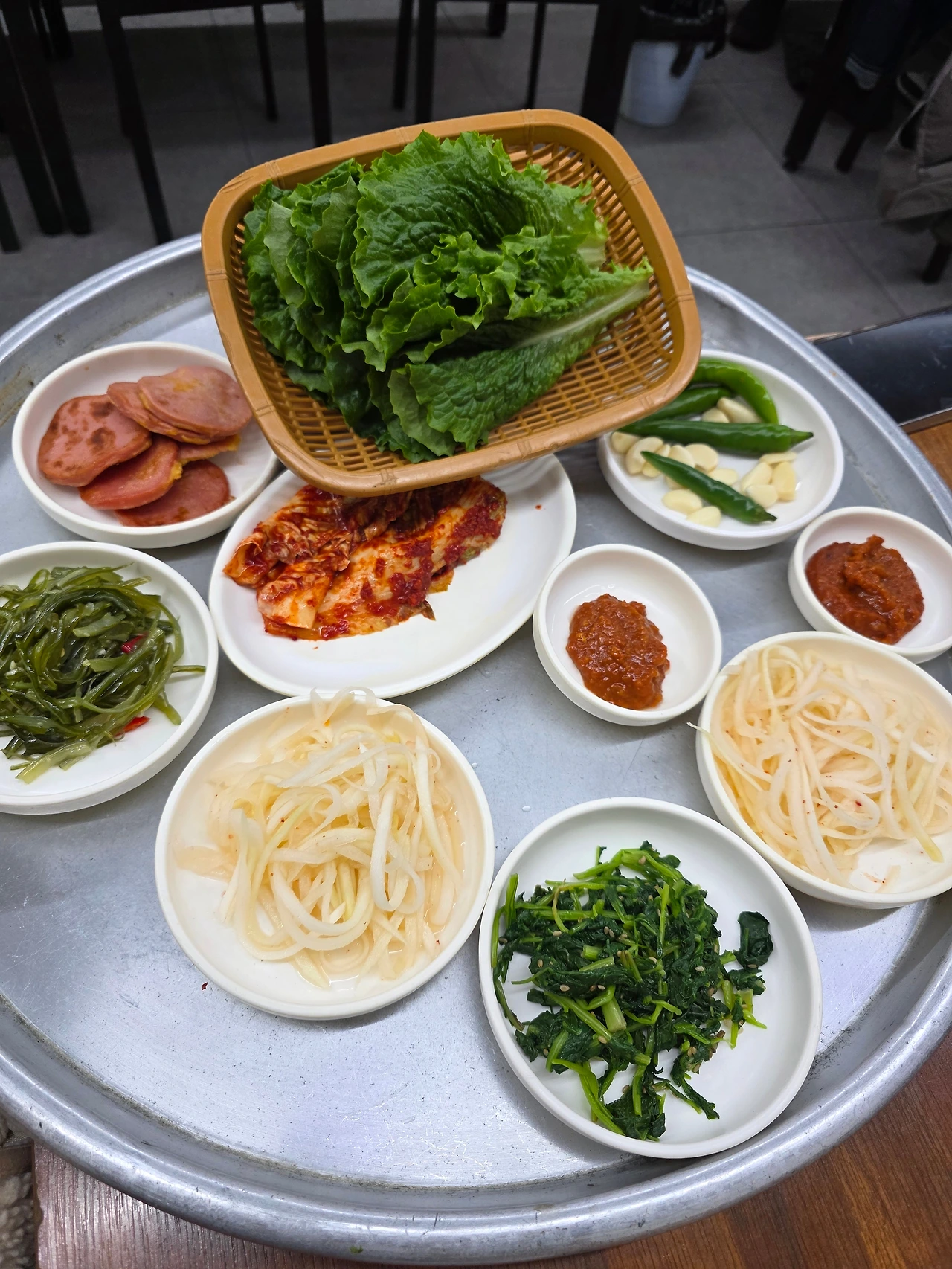 이런저런 이야기를 하면서 음식을 기다리던 도중에 밥과 반찬, 된장찌개와 쌈채소가 먼저 모습을 드러낸다. 미역줄기, 무생채, 땡초와 마늘, 쌈장에 쌈추와 깻잎을 담은 아담한 플라스틱 소쿠리. 그리고 어두컴컴한 빛깔의 무쇠팬 위로 붉은 돼지고기가 나온다.