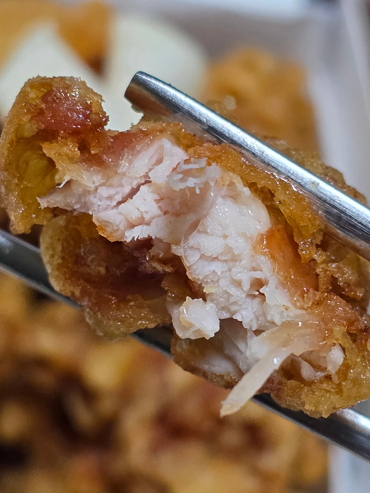 튀김옷을 지나고 나면 그 밑에 숨어있던 덜 익은 반죽과 같은 식감의 튀김옷이 잇몸 위에 질척거리듯 부드럽게 미끄러진다. 뒤이어 따라오는 닭다리의 쫄깃함 식감과 육즙 가득한 속살. 바삭함과 푹신함, 거기에 탱글거리면서 고소한 닭의 육질이 입안을 가득 채운다. 거를 타선이 없이 풍족한 미식이다.