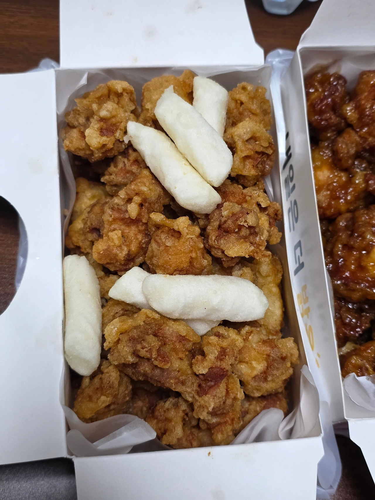 문구점에서 팔던 두꺼운 종이 재질의 닭튀김박스 2개를 연다. 노릇노릇하게 튀겨진 닭튀김의 냄새가 고소하게 피어오르며 김고로의 코를 간지럽힌다. 한쪽에서는 황금빛의 튀김옷과 떡볶이떡, 나머지 한쪽에서는 갈색의 양념 옷을 입은 닭강정이 거실 형광등의 빛을 받아 윤기를 반짝이며 달착지근한 향기를 뿜는다.