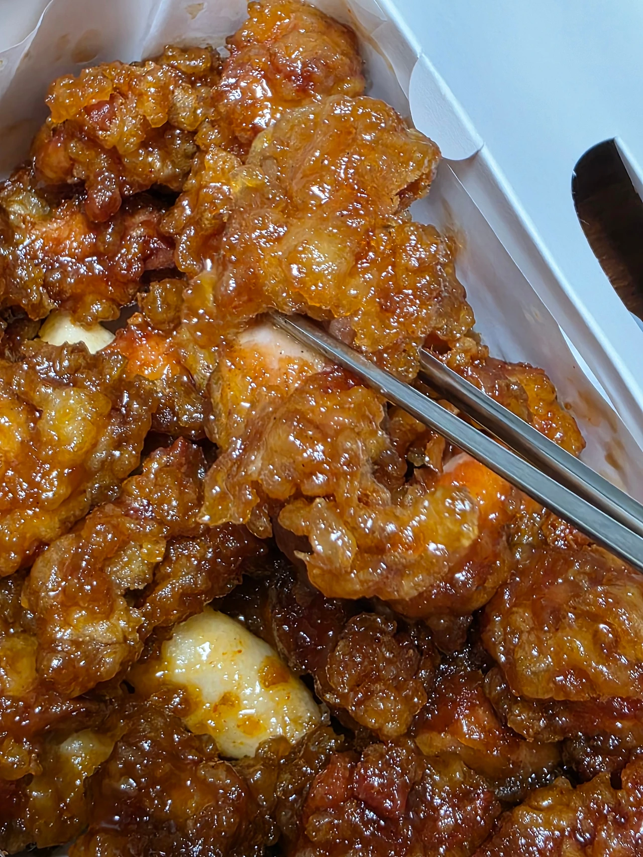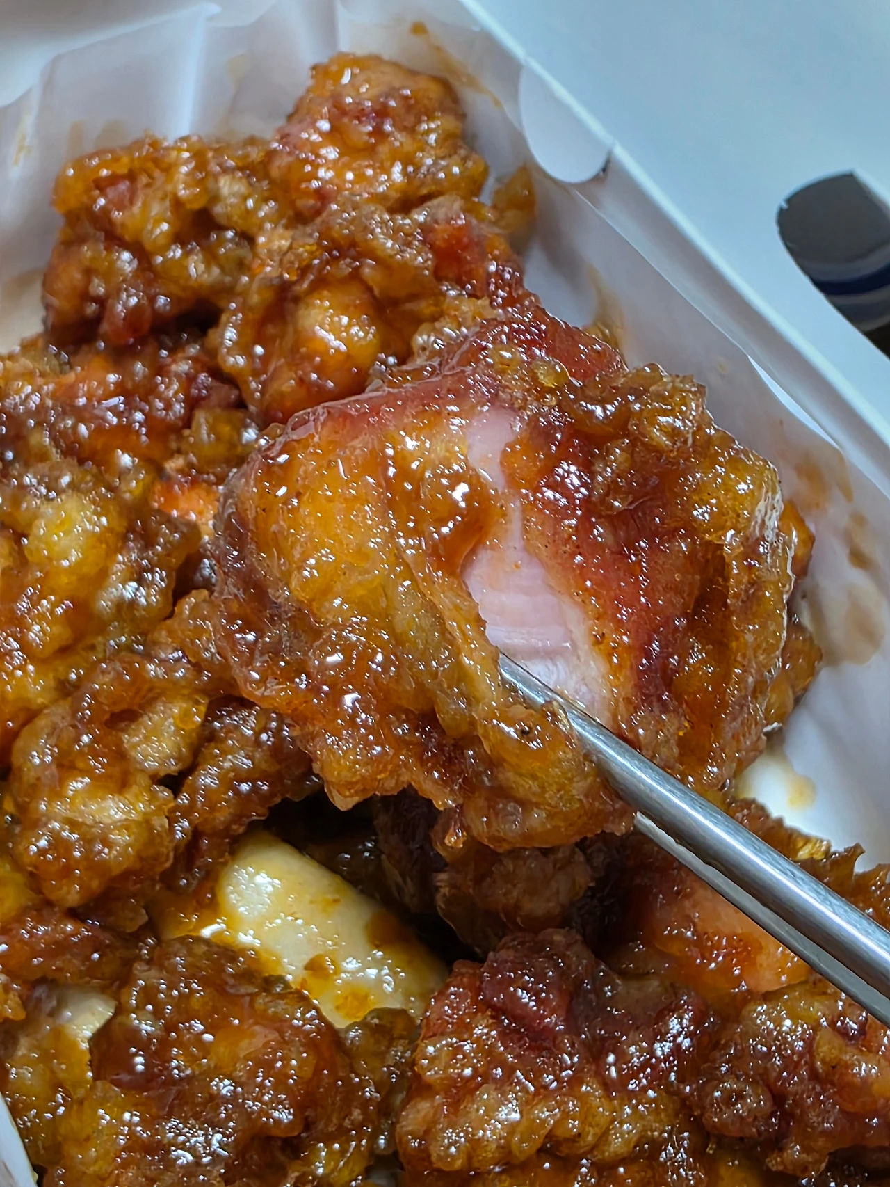 '닭고기의 쫄깃하고 기름진 맛이 소나기를 뿌리면, 달착지근한 매콤함으로 덮어주는구나. 이 또한 매력적인 파괴력의 조합이다.'