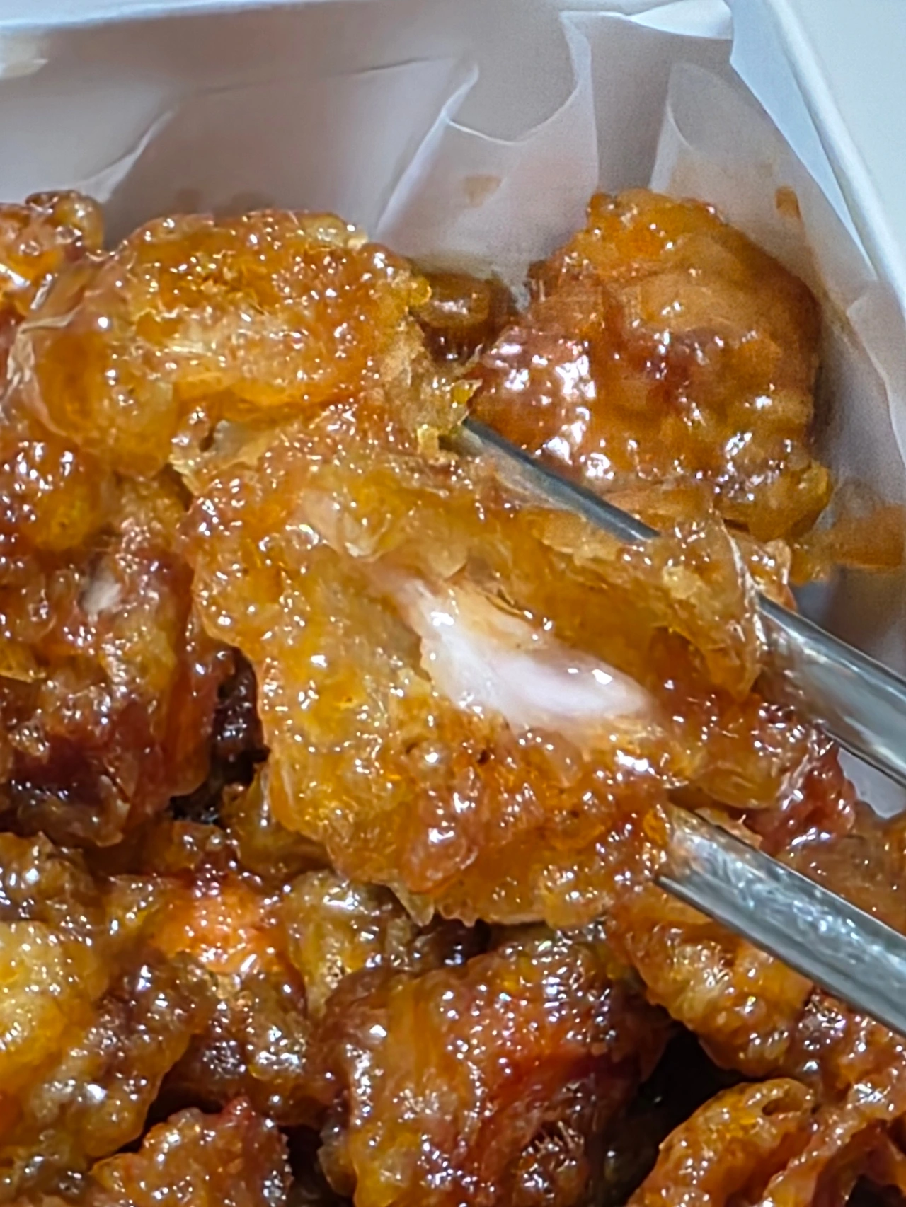 그리고 김고로는 양념닭강정으로 손을 돌린다. 후라이드의 맛을 충분히 확인했으니 이제 양념닭튀김의 순서다. 후라이드에 찍어 먹는 소스와는 맛이 다르니, 어떤 맛일지 호기심과 함께 젓가락을 움직인다.