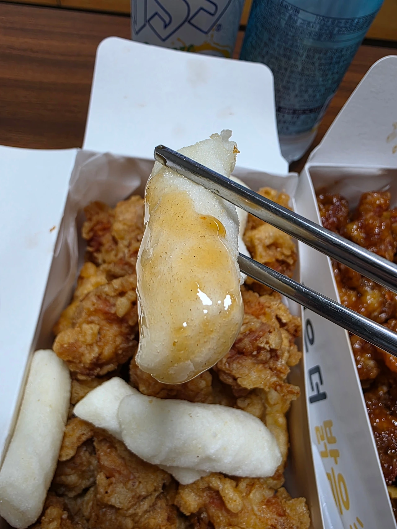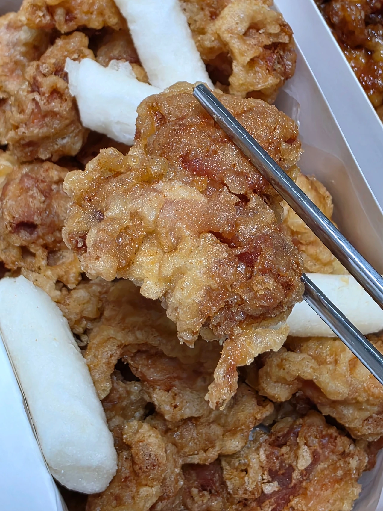 확실히, 재송한마음시장 통큰닭강정의 닭튀김은 강릉이나 속초에서도 먹어본 일이 없는 종류다, 적어도 김고로에게는 말이다. 대부분이 살짝 두께가 있는 단단한 튀김옷에 바삭함을 강조하고 빈틈없이 강렬한 양념을 추구하고 있기에 가벼운 바삭함과 푹신한 튀김옷은 속초와 강릉에서 거의 볼 일이 없다.