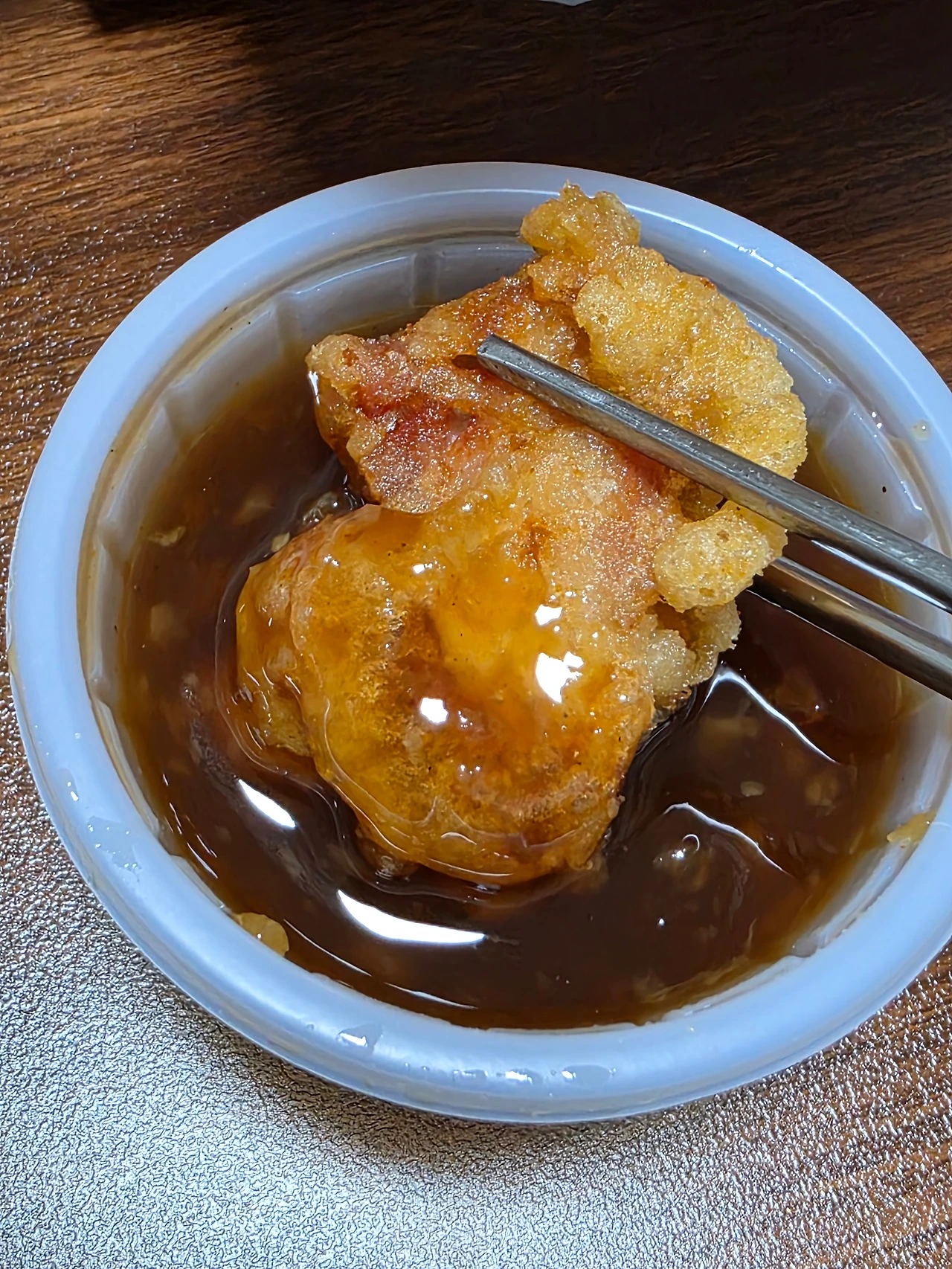 김고로는 연이어서 하나를 더 집어 따로 주신 소스에 찍어먹는다. 가게에서 자체적으로 만든 마늘양념소스, 후라이드닭강정 조각을 소스 그릇 바닥까지 푹 담가서 양념옷을 입힌다. 길고 잘게 다져진 마늘 조각들이 튀김옷 위에 걸려 올라온다.