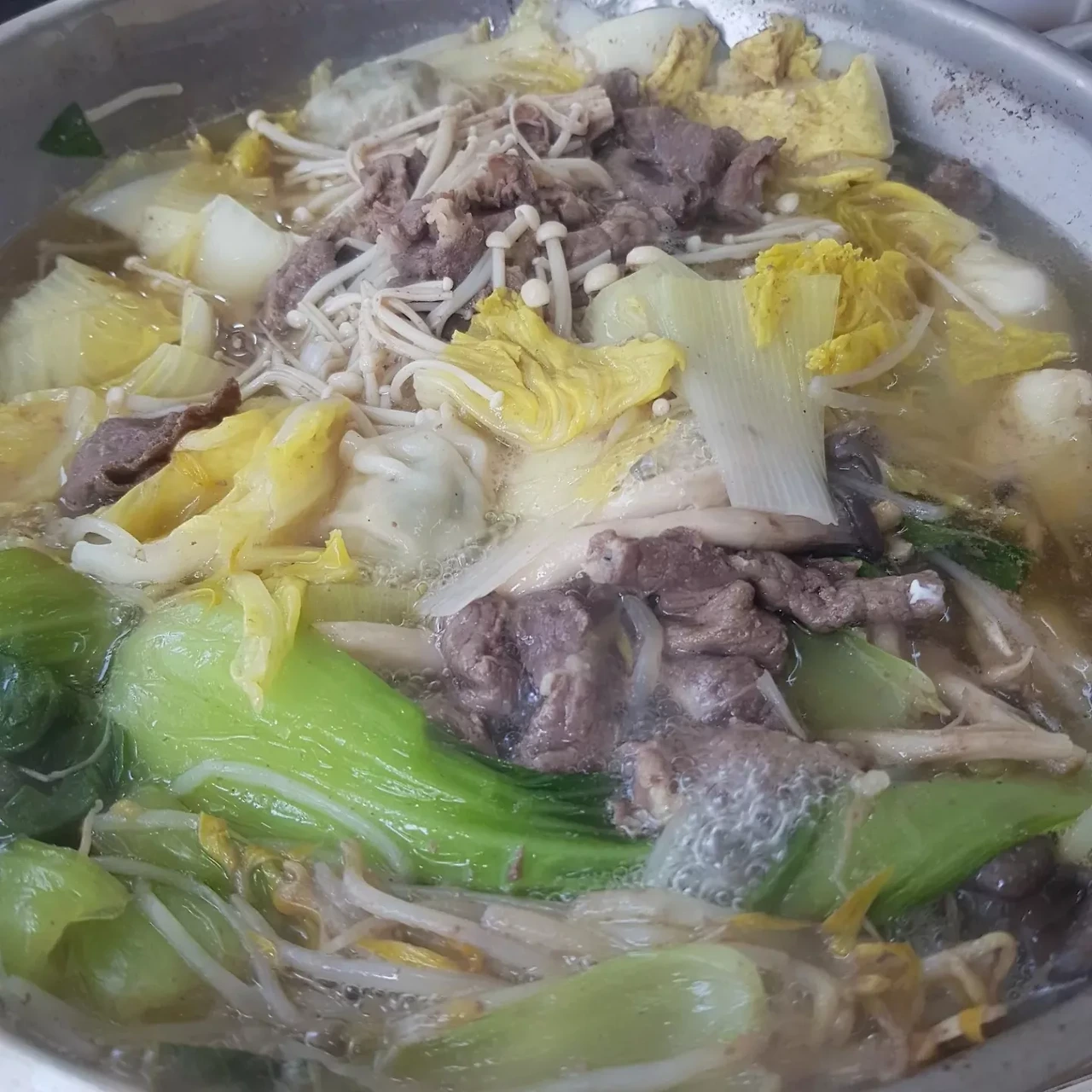 청경채, 배추를 비롯한 잎채소와 버섯들로 깔끔함과 산뜻함, 재료들의 고유의 감칠맛과 가벼움을 입히고 그 후에는 묵직함과 고소함을 더해줄 얇게 썰린 쇠고기가 추가된다.