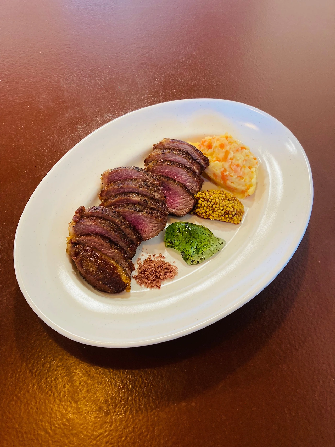 생후 6개월 미만 어린양의 갈빗살을 수비드하여 익혀낸 것을 팬에서 구워낸 스테이크. 와인소금, 민트잼, 홀그레인 머스터드와 으깬 감자당근이 곁들여져 나온다. 어느 소스를 곁들여 먹더라도 눈을 감고 '음~'하는 소리가 나왔다, 어린양은 정말 부드럽다. 겉은 바삭하고 속은 촉촉하니 부드럽다. 상큼하며 짭짤하고 와인의 풍미가 은근히 느껴지는 소금에 살짝 찍어먹으면 짭짤하고 새콤한 맛이 즐겁다. 호주에서 양고기를 먹으면 민트소스가 함께 나와 먹었었는데 산치식당에서도 민트와 먹을 수 있으니 반가웠다. 달콤하면서 약간의 매운맛이 섞인 즐거운 박하맛이 코로 올라오니 고기가 더 당긴다 (민트잼은 일반적인 한국사람들에게 익숙한 맛이 아니다, 잘못 고르면 단맛과 박하향이 극에 달해서 기분이 나빠질 수도 있는 것이다. 그렇기 때문에 산치맨은 여러 가지 제품 중에서 알맞은 제품을 찾느라 공을 들였다고 했다). 그리고 입안에서 톡톡 터지는 알싸한 겨자소스, 씨앗이 터지면서 겨자의 풍미가 살아나고 진한 고기 맛으로만 물들여질 수 있는 혀를 3가지의 소스가 방지해준다. 그리고 곁들여 먹는 으깬 감자와 당근은 처음부터 끝까지 고소하다, 우유와도 같은 유지방의 풍미와 원재료의 포근함, 은근한 달달함. 개인적으로 여태 먹었던 으깬감자 중에서 기억에 남을만한 맛이다. 그리고 다시 시작되는 고기, 소금, 민트, 겨자, 으깬 탄수화물, 색색의 회전목마가 돌아가고 나니 그릇은 금세 아무것도 없는 그릇이 되었다.