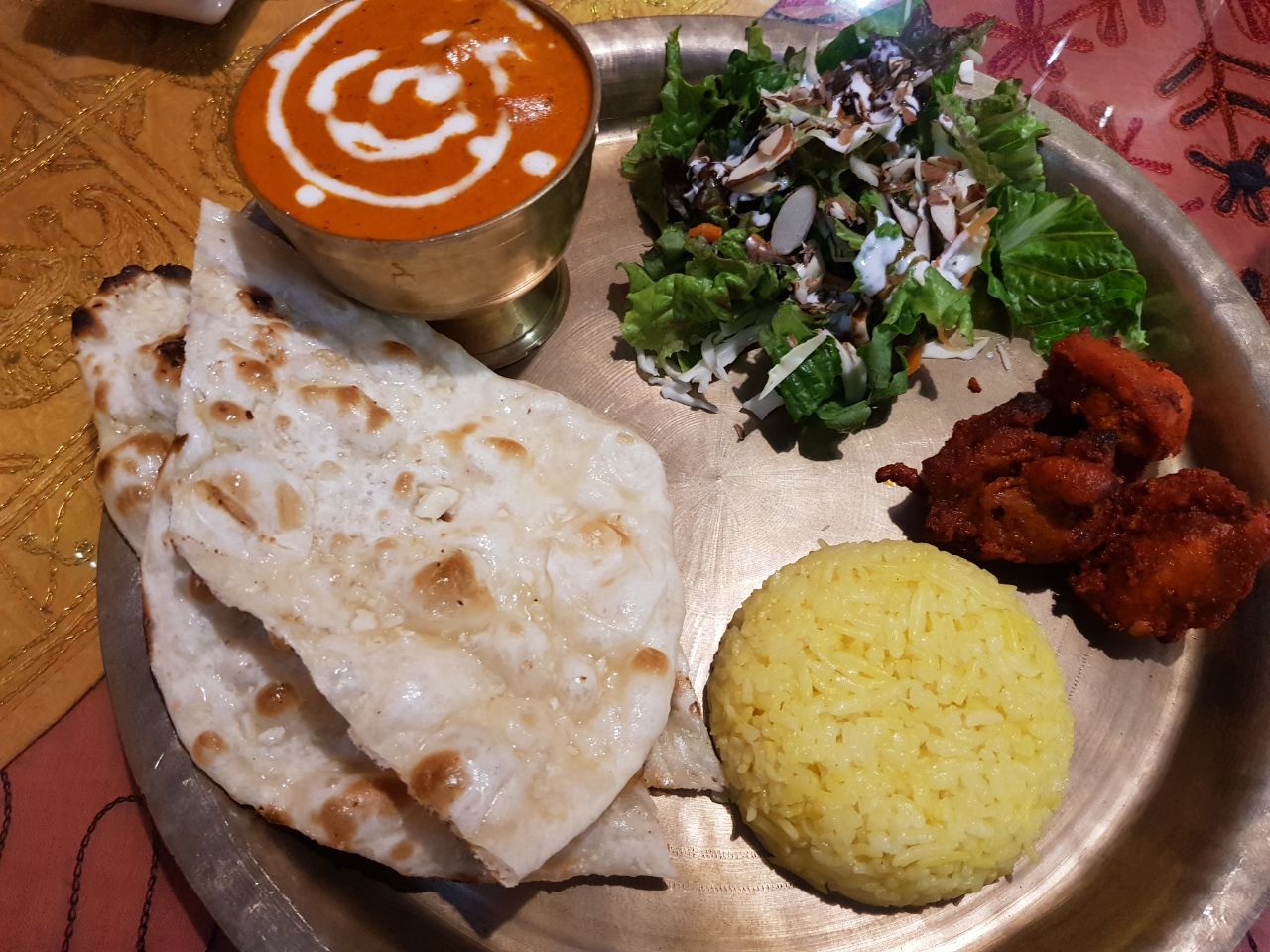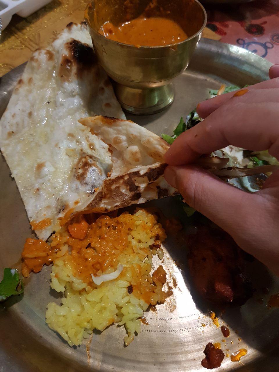 옆에서 식사를 하고 계시는 인도분들처럼 우리도 각 사람마다 은쟁반에 주문한 음식들이 올려져 나왔다. 너무 맛있어 보여서 먼저 먹을 뻔했지만 흥분한 나의 손을 가라앉히고 다른 이의 식사를 방해하지 않도록 나의 음식만을 카메라에 담았다. 그리고 인도의 식사예절을 따라 나의 왼손은 감추고 오른손의 엄지, 검지, 중지, 약지를 들어 식사를 시작했다. 물론 인도라고 해서 모든 사람들이 다 손으로 식사를 하는 것은 아니다, 포크와 나이프 등의 식기를 사용해서 식사를 하기도 하지만 나는 이 날만큼은 오래간만에 제대로 된 인도요리를 영접한 기념으로 옆에서 식사를 하고 계시는 인도분들처럼 손으로 먹고 싶었다. 새끼손가락을 제외한 오른쪽의 손가락들로 바로 치킨 티카를 집어 먹었다.