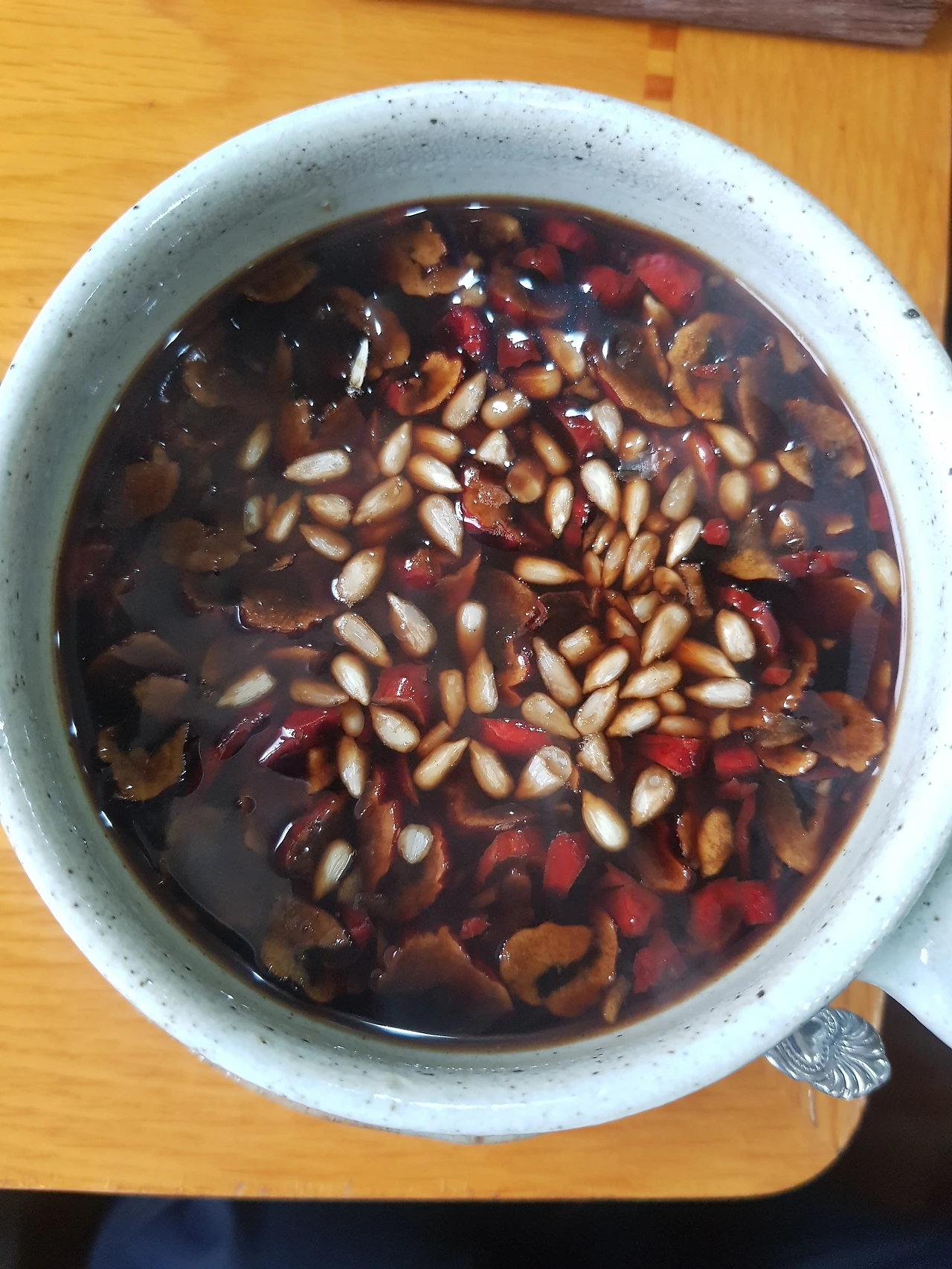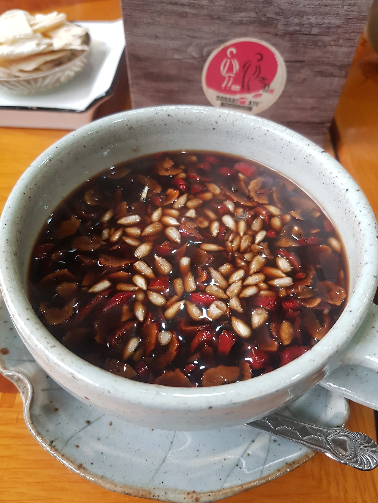 그리고 곧 이어 대추와 잣 등 온갖 재료가 가득 들어간, 밤하늘처럼 투명하게 빛나는 쌍화차가 등장했다. 컵의 크기로 보나, 양으로 보나 '쌍화차'보다는 '쌍화탕'으로 불리는 것이 맞는 모습이었다. 한입 머금으니 쌉쌀한 한약의 맛이 혀를 덮다가 끝에 은근한 단맛이 슬쩍 입안을 감싸는 맛이 고급진 맛이었다. 편의점이나 약국에서 사 먹던 '쌍화수' 혹은 '쌍화탕'의 진짜 본체가 이러한 맛이라니.