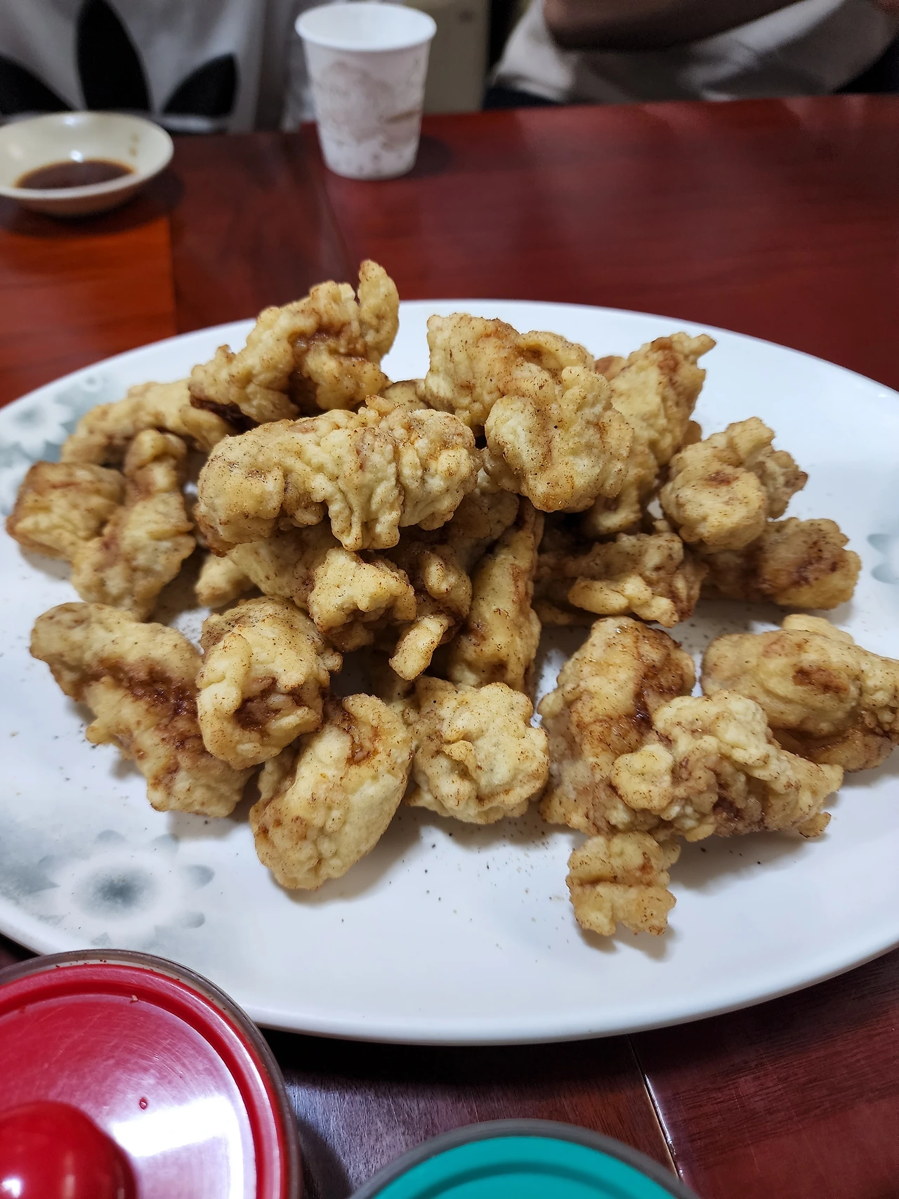 겉은 바삭바삭하고 튀김의 속은 부드러웠다, 고기는 쫄깃하고 잘 익은 고기의 육즙이 구수하다. 간장에 식초를 약간 섞어 초간장을 찍어 먹으니 고소한 고기튀김의 맛이 입안에 가득하다.